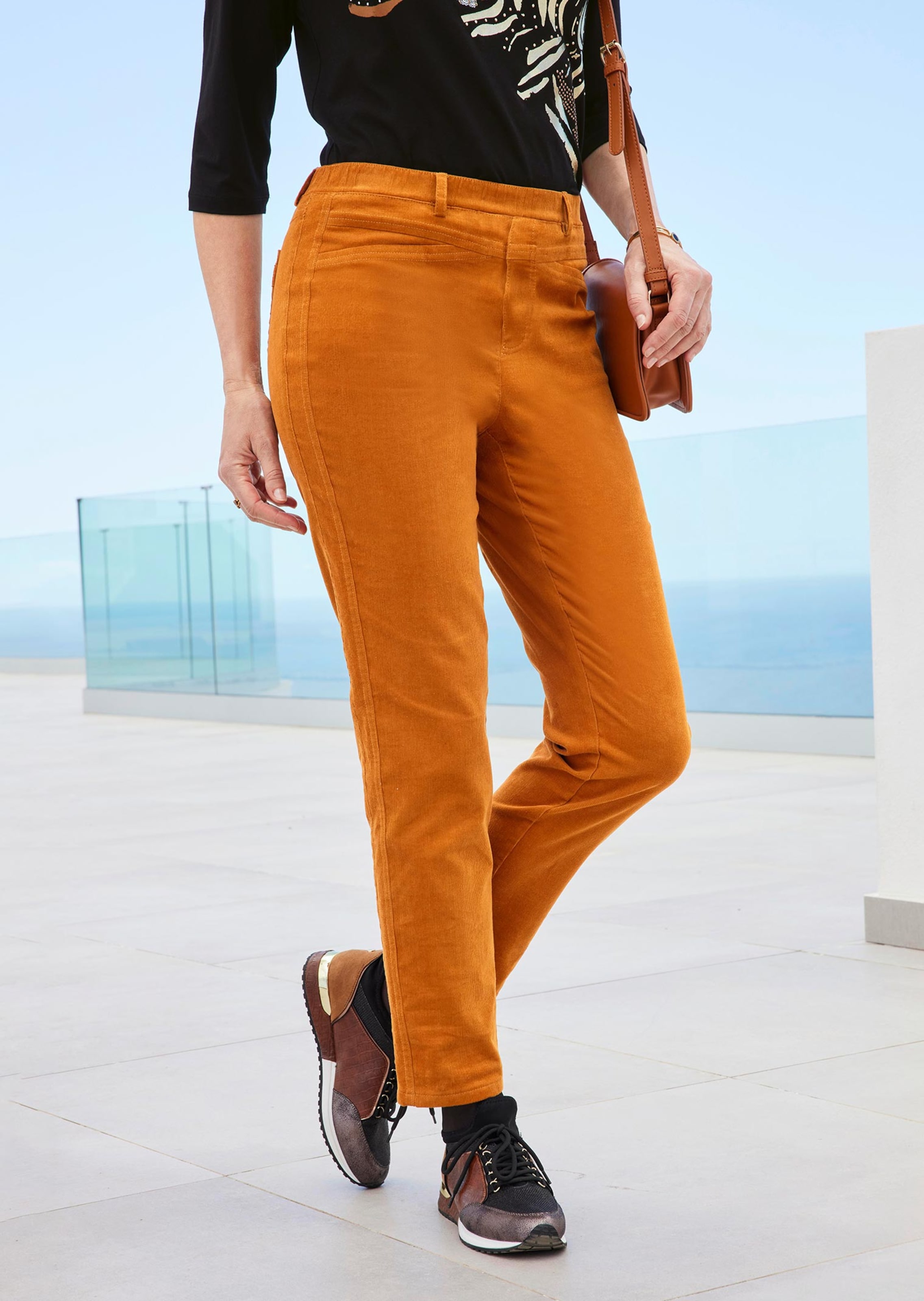 Cordhose aus supersoftem, elastischem Cord. Schlupfbund mit Gürtelschlaufen, optischem Reißverschluss und angedeutete Taschen im Vorderteil – nichts trägt auf. Die aufwendige Schnittführung mit Sattel im Vorder- und Rückteil kaschiert perfekt. Aufgesetzte Gesäßtaschen. Saumweite ca. 36 cm. Schmale Beinweite.