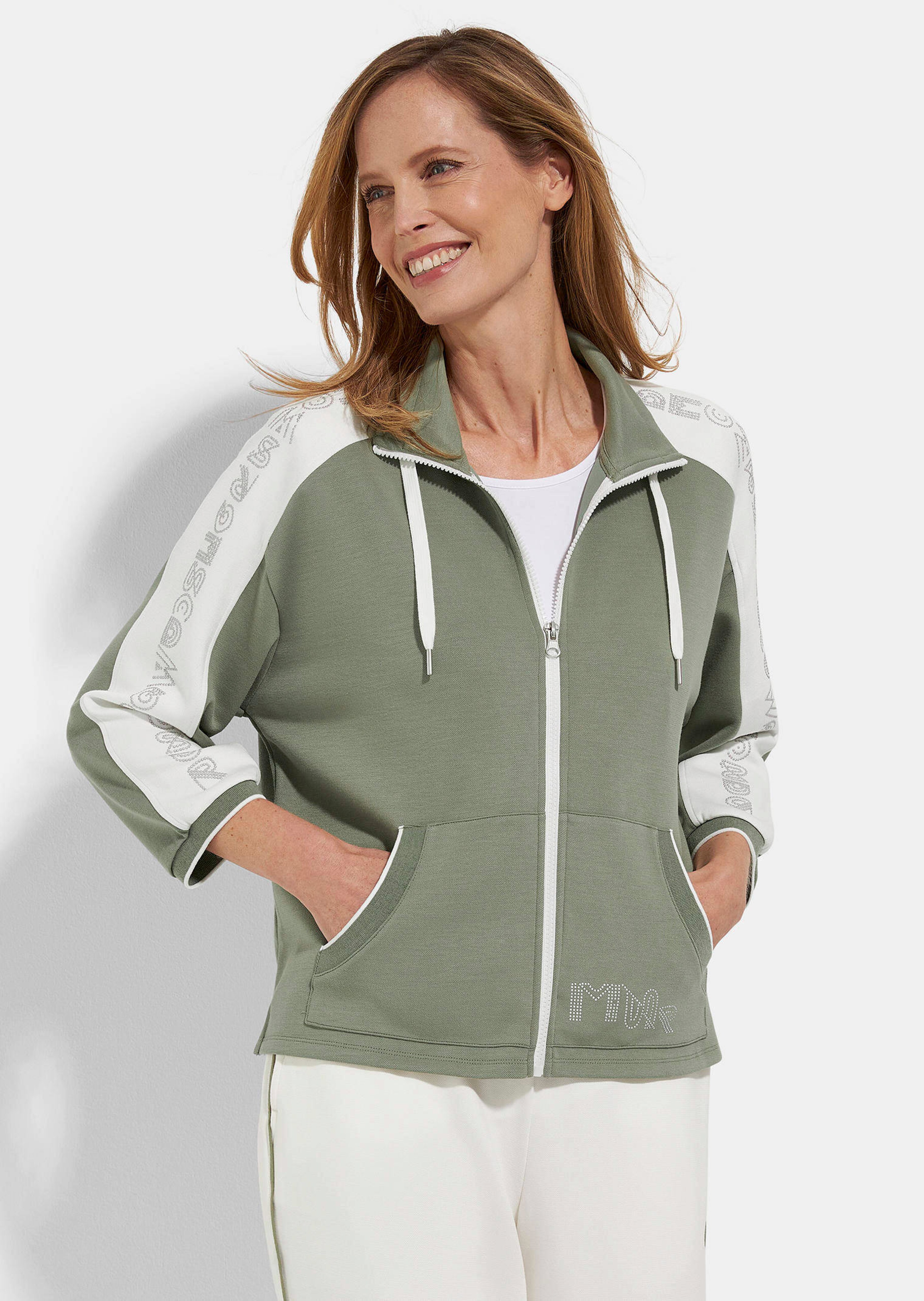 Sweatjacke von BARBARA LEBEK mit 3/4-langen Ärmeln. Der Stehkragen ist mit Tunnelzug und Band gearbeitet, aufgesetzte Kängurutaschen bieten praktischen Nutzen. Ein stilisierter Schriftzug aus edel, matt schimmernden Metallsteinchen schmückt Ärmel und Taschen und setzt einen dezenten Blickfang. Mit kontrastfarbenen Reißverschluss und kleinen Seitenschlitzen. Aus einer soften, trageangenehmen Sweat-Qualität – sportiv im Look, spürbar im Komfort. Länge ca. 64 cm in Gr. 46.