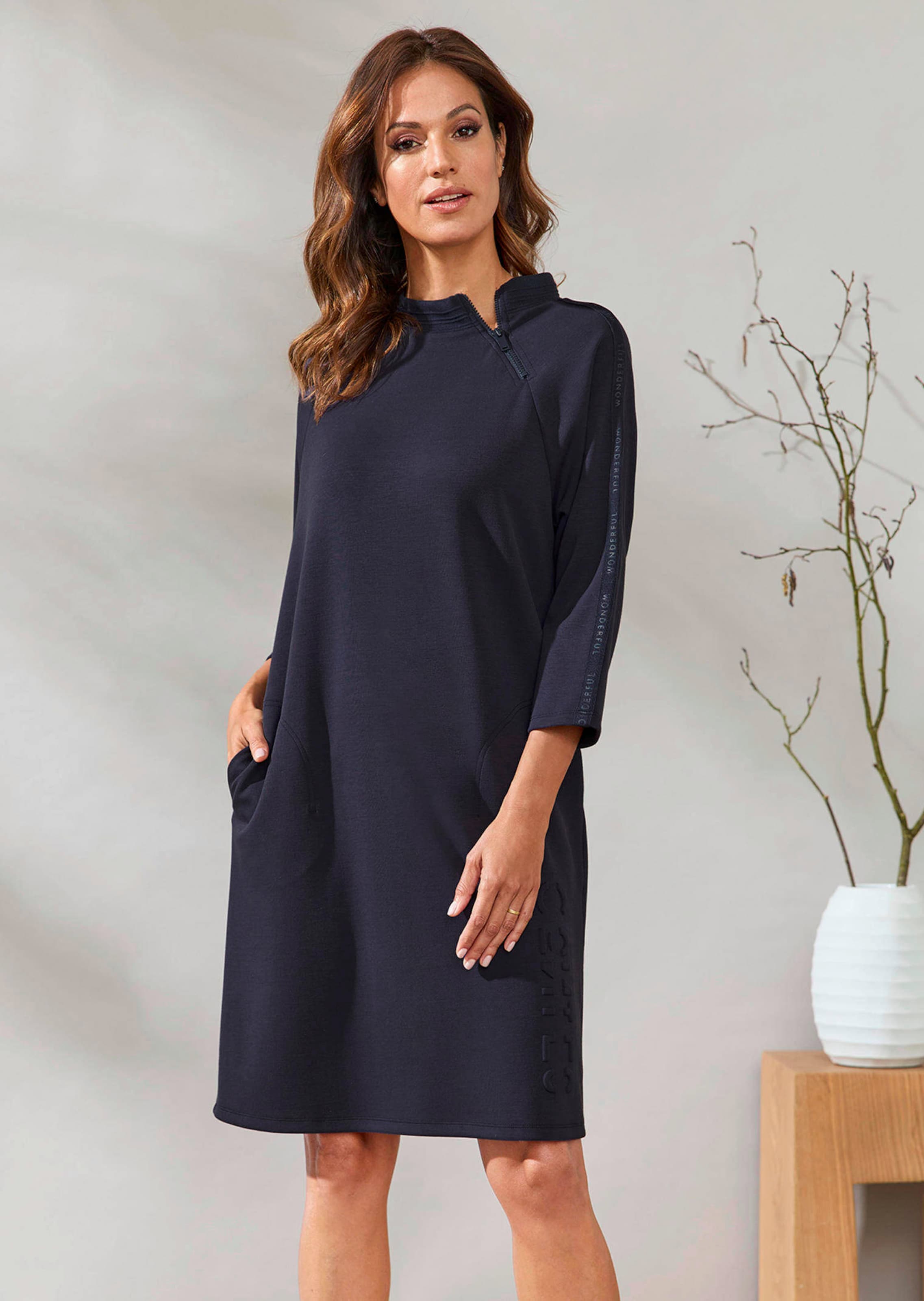 Freizeitkleid von BARBARA LEBEK. Der seitliche Prägeschriftzug sorgt für einen modernen Blickfang, während der supersofte Jersey aus Viskosemischung ein angenehmes Tragegefühl bietet. Der dekorative Stehkragen in feiner Strickoptik ist mit einem Reißverschluss gearbeitet, was das Anziehen erleichtert. Raglanärmel mit Ripsband und 3/4-Länge bringen sportliche Leichtigkeit. In legerem, geradem Schnitt mit zwei Eingriffstaschen. Länge ca. 100 cm in Gr. 46.