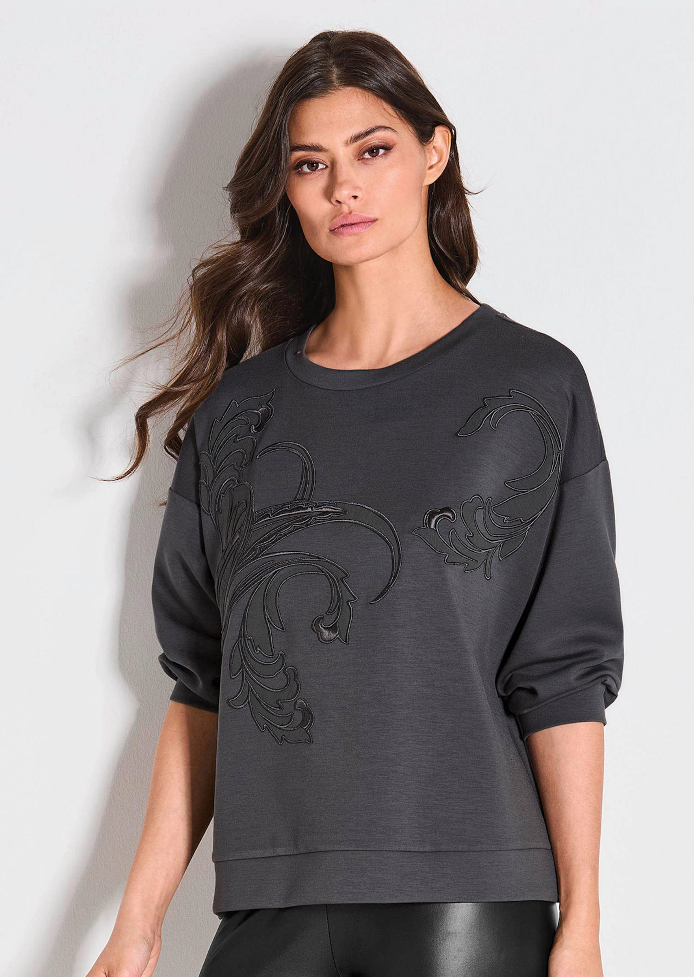 Sweatshirt von BETTY BARCLAY mit tonaler Ornament-Stickerei in Blütenform. Zartes Glanzgarn sorgt für einen exklusiven Look. Der supersofte Viskosemix mit Elasthan trägt sich angenehm, die legere Form mit Rundhalsausschnitt, überschnittenen Schultern und Ärmelbündchen bringt eine sportive Note mit sich. Für Bewegungsfreiheit sorgt der breite Bündchenabschluss mit Seitenschlitzen. Länge ca. 66 cm in Gr. 46.