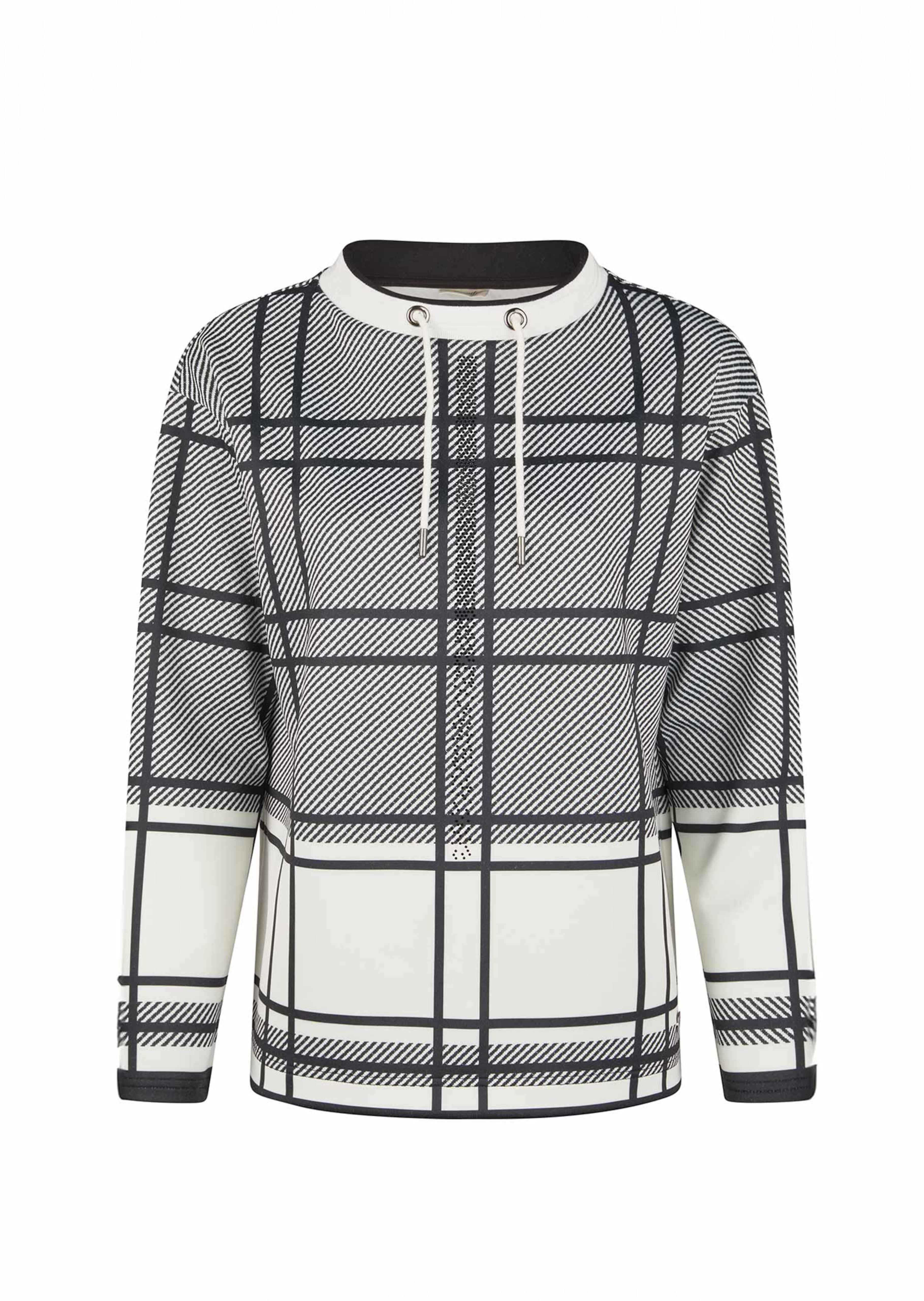 Sweatshirt von BARBARA LEBEK in kontrastreichem Karo-Dessin. Die lÃĪngs aufgesetzte Steinchenblende im Vorderteil ist ein dekorativer Hingucker! Das gestrickte BÞndchen mit Kordelzug am Rundhalsausschnitt verleiht dem Modell eine sportive Note. In glatter, leichter QualitÃĪt, mit kleinen Seitenschlitzen am Saum. LÃĪnge ca. 65 cm in Gr. 46.