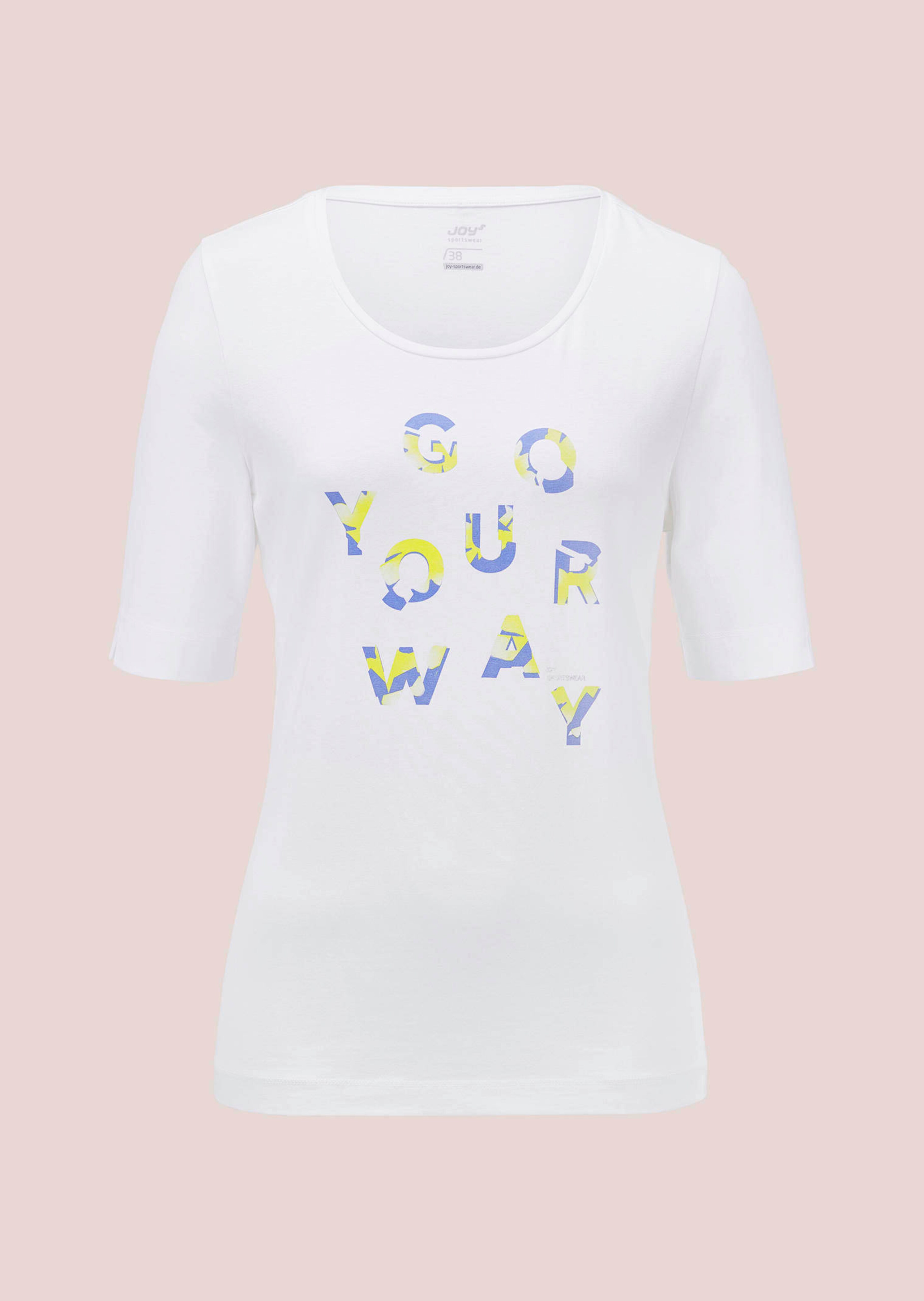 Ein fröhlicher Schriftzug sorgt für gute Laune bei jedem Look – das T-Shirt von JOY ist locker geschnitten und begleitet Sie angenehm durch den Tag. Der Rundhalsausschnitt und die halblangen Ärmel mit kleinen Seitenschlitzen setzen dezente Akzente, während der gerade Saum für einen tollen Abschluss sorgt. Dank des weichen, elastischen Materials behält das Shirt seine Form und ist gleichzeitig besonders angenehm auf der Haut.