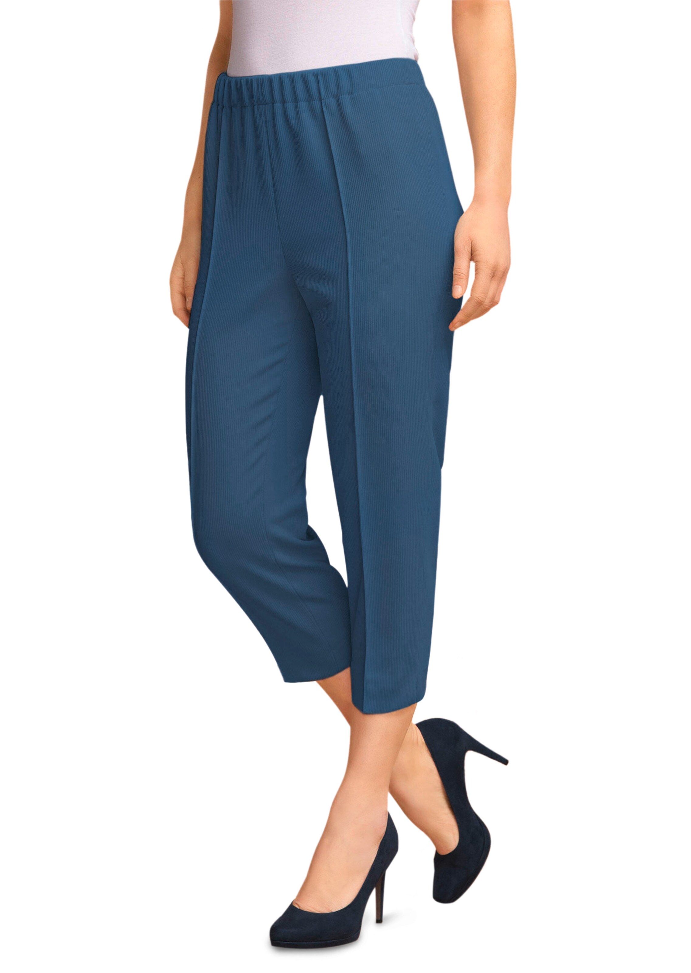 7/8-Rippenhose CARLA mit Schlupfbund – perfekt für längere Bus- oder Autofahrten. Das strapazierfähige Wirkmaterial ist angenehm weich, knitterarm und formstabil. Dank der unkomplizierten Waschen-Trocknen-Anziehen-Qualität ist sie immer wieder schnell einsatzbereit. Für eine vorteilhafte Figur wurde das Modell vorn mit abgesteppten Biesen ausgestattet. Saumweite ca. 44 cm. Gerader Beinverlauf.