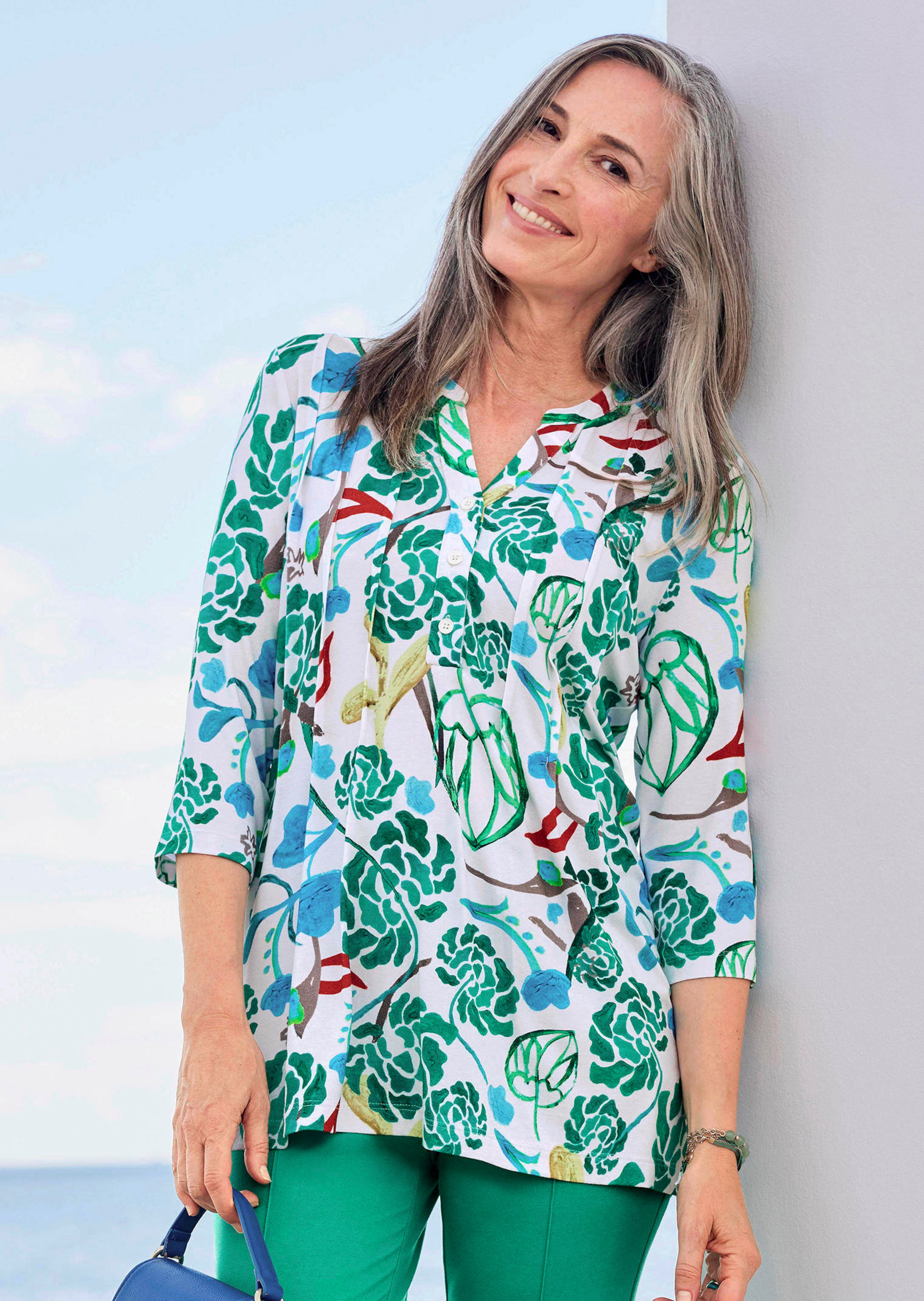 Tunika in effektvollem Alloverprint. Die frischen Farben ziehen alle Blicke auf sich. Der Rundhalsausschnitt ist mit einer Formblende gearbeitet, die Knopfleiste reicht bis zur Taille. Biesen im Vorderteil sorgen für eine angenehme Mehrweite. Mit 3/4-Arm und geraden Säumen. Aus stretchbequemem Viskose-Jersey ein luftiger Begleiter für die warme Jahreszeit! Länge ca. 73 cm in Gr. 46, ca. 69 cm in Gr. 23.