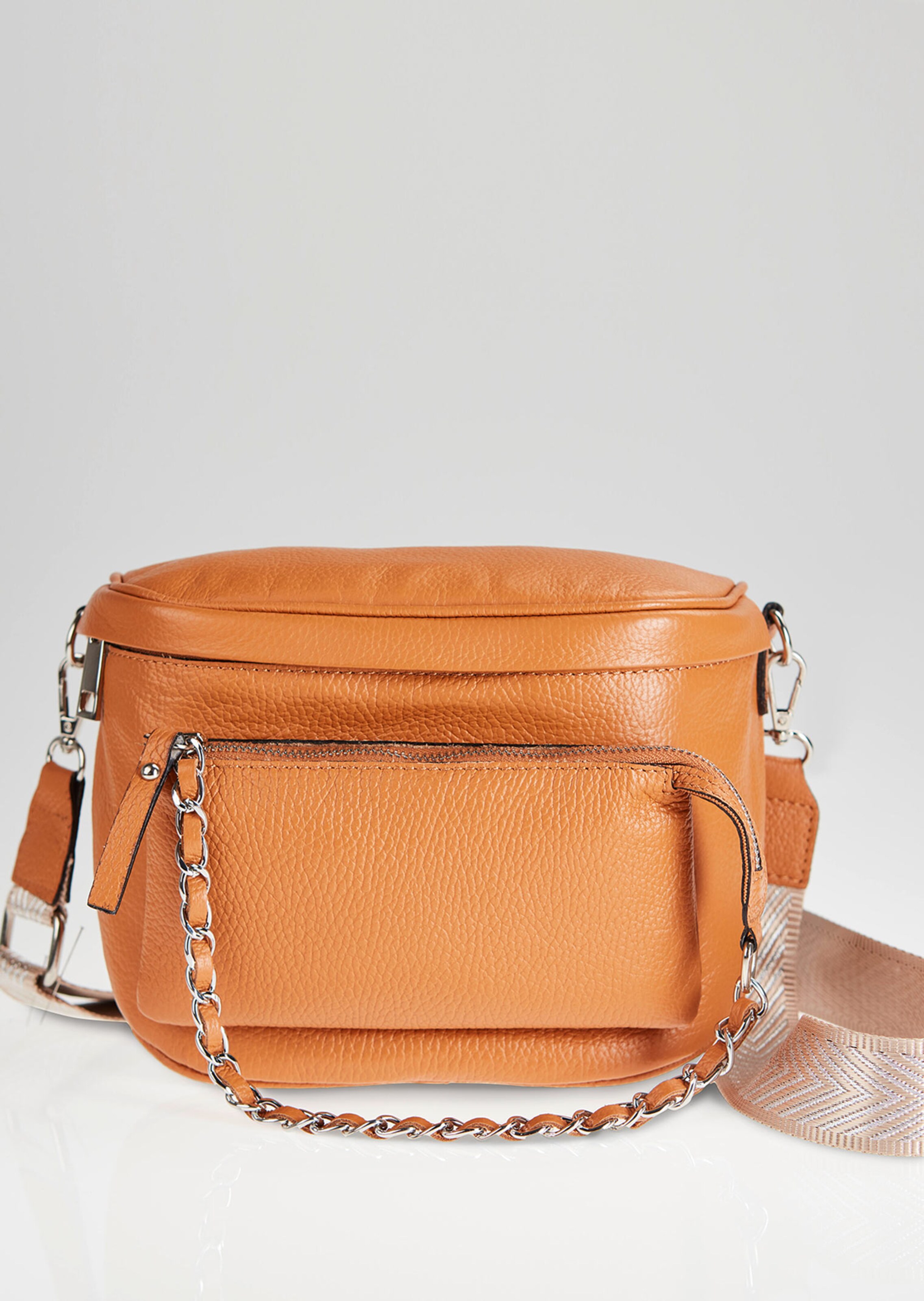 Umhängetasche aus echtem Leder und in Italien gefertigt. Das Mode-Highlight der Saison ist diese hochwertige Tasche in praktischer Größe, die dank des großzügigen Innenfachs genug Stauraum für Ihre Wertsachen und Alltägliches bietet. Die außen aufgesetzte, kleine Tasche ziert eine silberfarbene Metallkette, die von einem Lederband durchzogen ist. Durch den verstellbaren Schultergurt aus hochwertig gewebtem Jacquard bieten sich vielseitige Tragemöglichkeiten. Das Modell kann auch Crossbody länger oder modisch kürzer im Gürteltaschen-Look getragen werden. Eine besondere Note verleihen die von Hand geschwärzten Kanten. Mit Futterinnentasche.