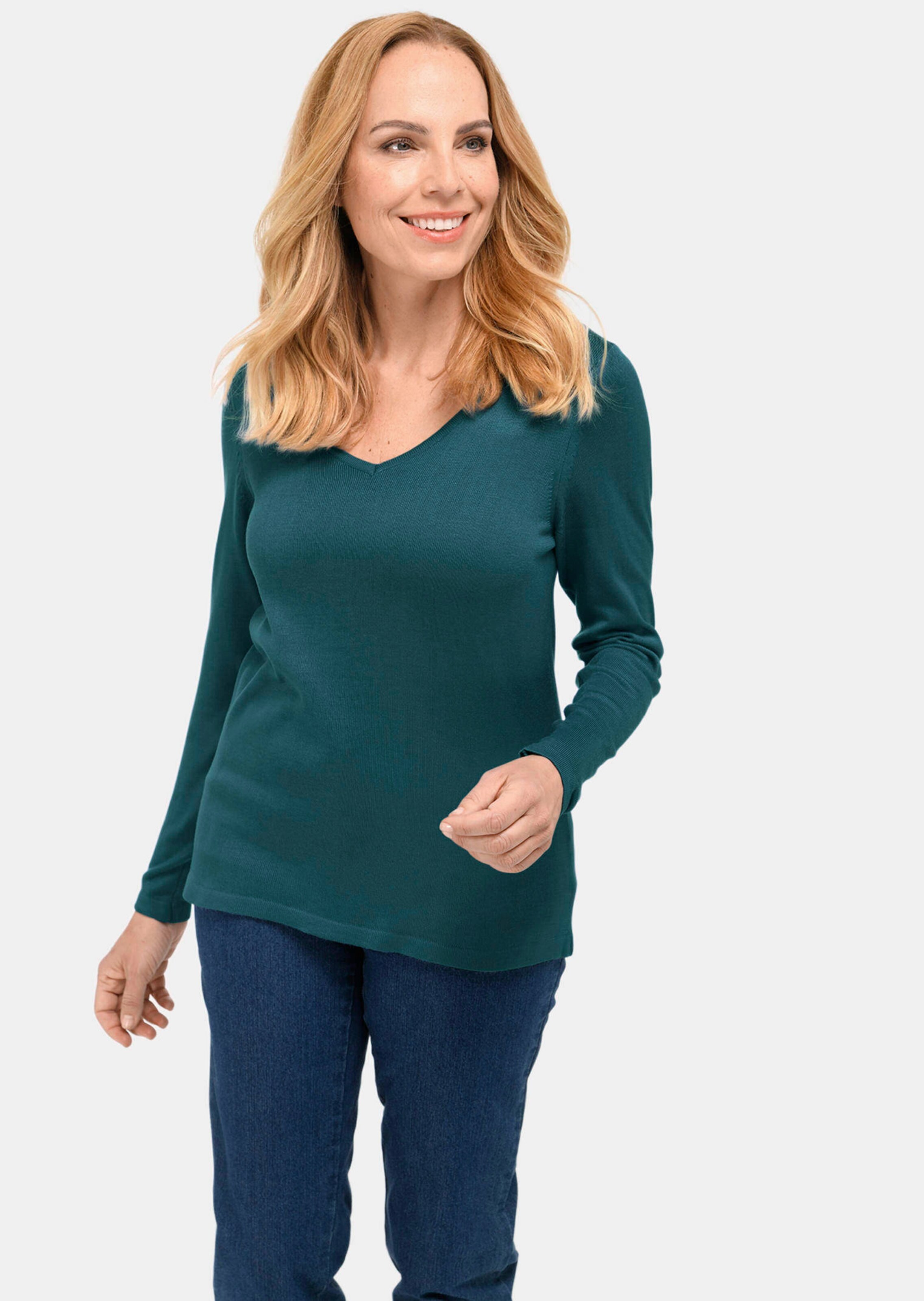V-Pullover in herrlich schönen Farben! Der edle Feinstrick trägt sich superangenehm. Damit das Modell auch perfekt sitzt, wurde es aufwendig in Form gestrickt. Der feminine V-Ausschnitt und die glatten Saumabschlüsse runden das geschmackvolle Modell perfekt ab. Ein unschlagbares Basic mit einem unschlagbaren Preis. Länge ca. 67 cm in Gr. 46, ca. 63 cm in Gr. 23.