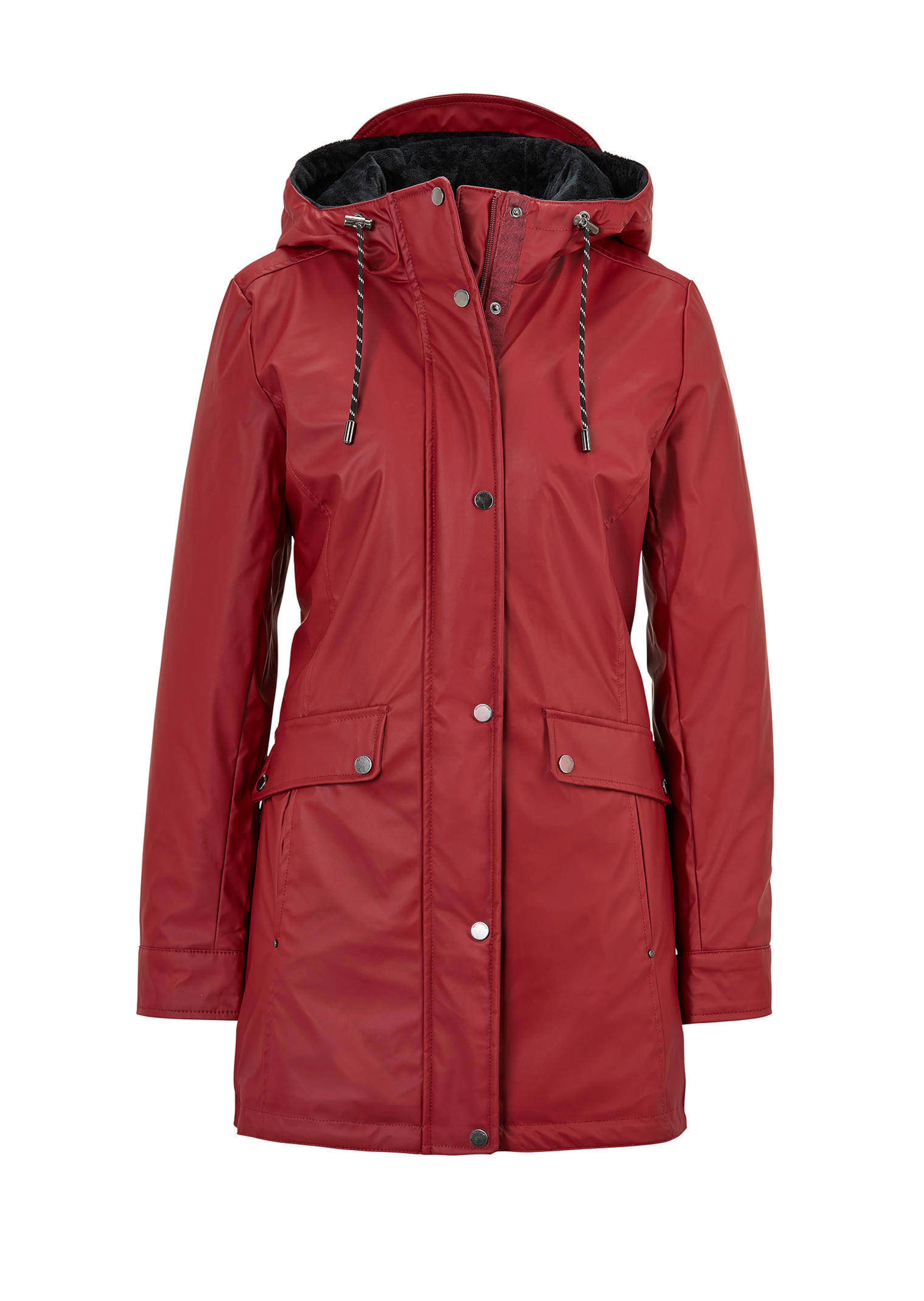 Regenjacke aus wasserdichtem Material in taillierter Passform – die lässt Sie nicht im Regen stehen! Die Kapuze mit kleinem Dach kann mit einem Kordelzug in der Weite reguliert werden. Das Innere der Kapuze und die Rückenpasse sind mit flauschigem Plüschfutter gearbeitet, so bleiben Sie nicht nur trocken, sondern auch warm. Reißverschluss mit einer zusätzlicher Knopfleiste, auch die Eingrifftaschen sind mit Patten und Druckknopf versehen, damit alles trocken bleibt. Passformnähte im Rückteil formen eine schöne Silhouette. Für eine gute Luftzirkulation sorgt ein Lüftungsschlitz am oberen Rücken. Dieses Modell fällt eine Nummer kleiner aus. Bitte bestellen Sie die Jacke eine Nummer größer als gewohnt.