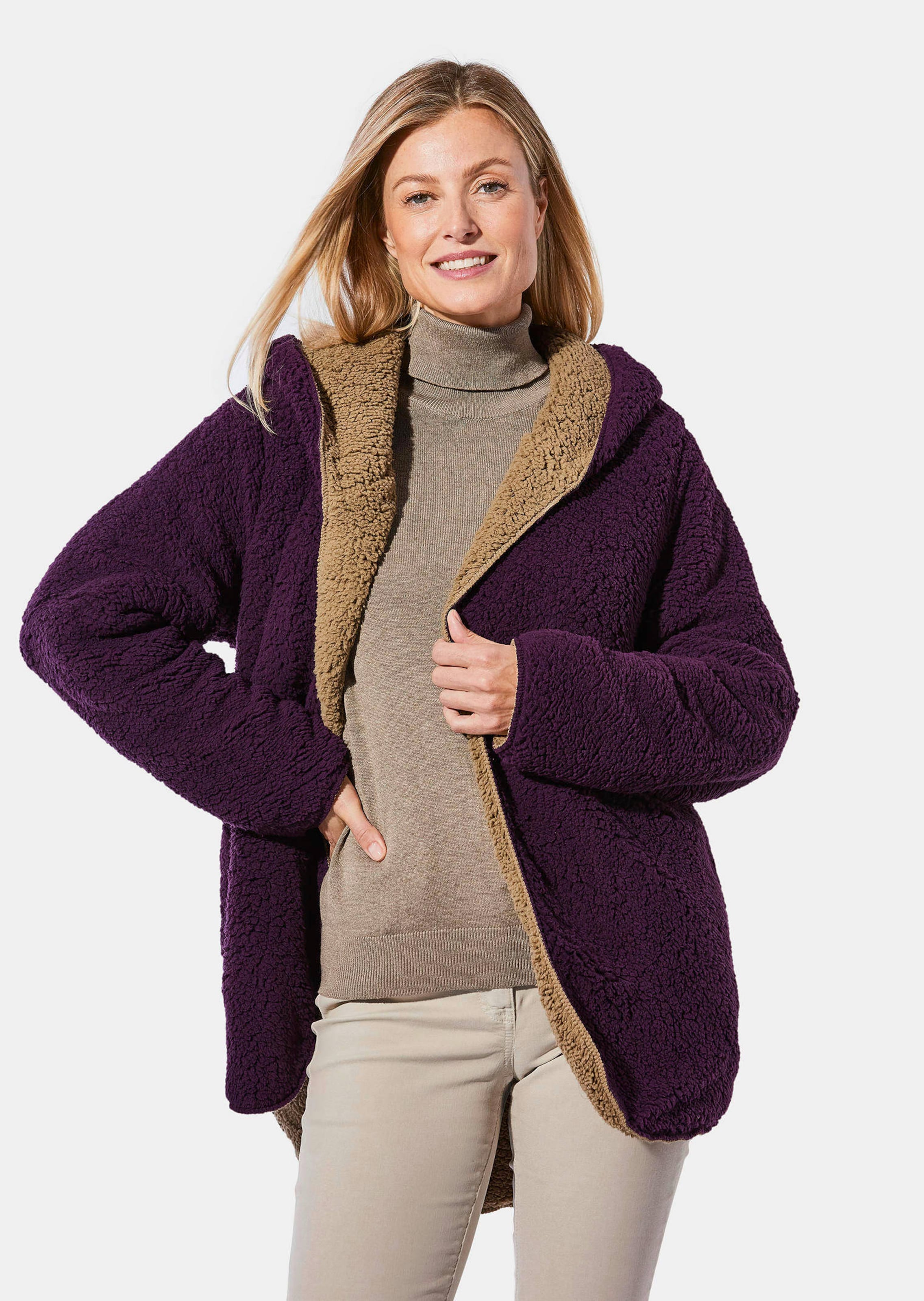 Jacke in besonders weicher Teddy-Optik. Dieses legere Modell mit Kapuze bietet einen spannenden Farbkontrast, denn die Innenseite ist in einer Zweitfarbe gestaltet. Aufgrund der cleveren Verarbeitung ohne Verschluss und mit seitlichen Taschen können Sie die Jacke nach Lust und Laune wenden und vielfältig kombinieren! Dabei bietet jede Tragevariante das herrliche Kuschelgefühl des Teddyplüsch. Die Ärmel lassen sich nach Belieben umschlagen, der Saum ist abgerundet. Dieses Modell fällt eine Nummer kleiner aus. Bitte bestellen Sie die Jacke eine Nummer größer als gewohnt.