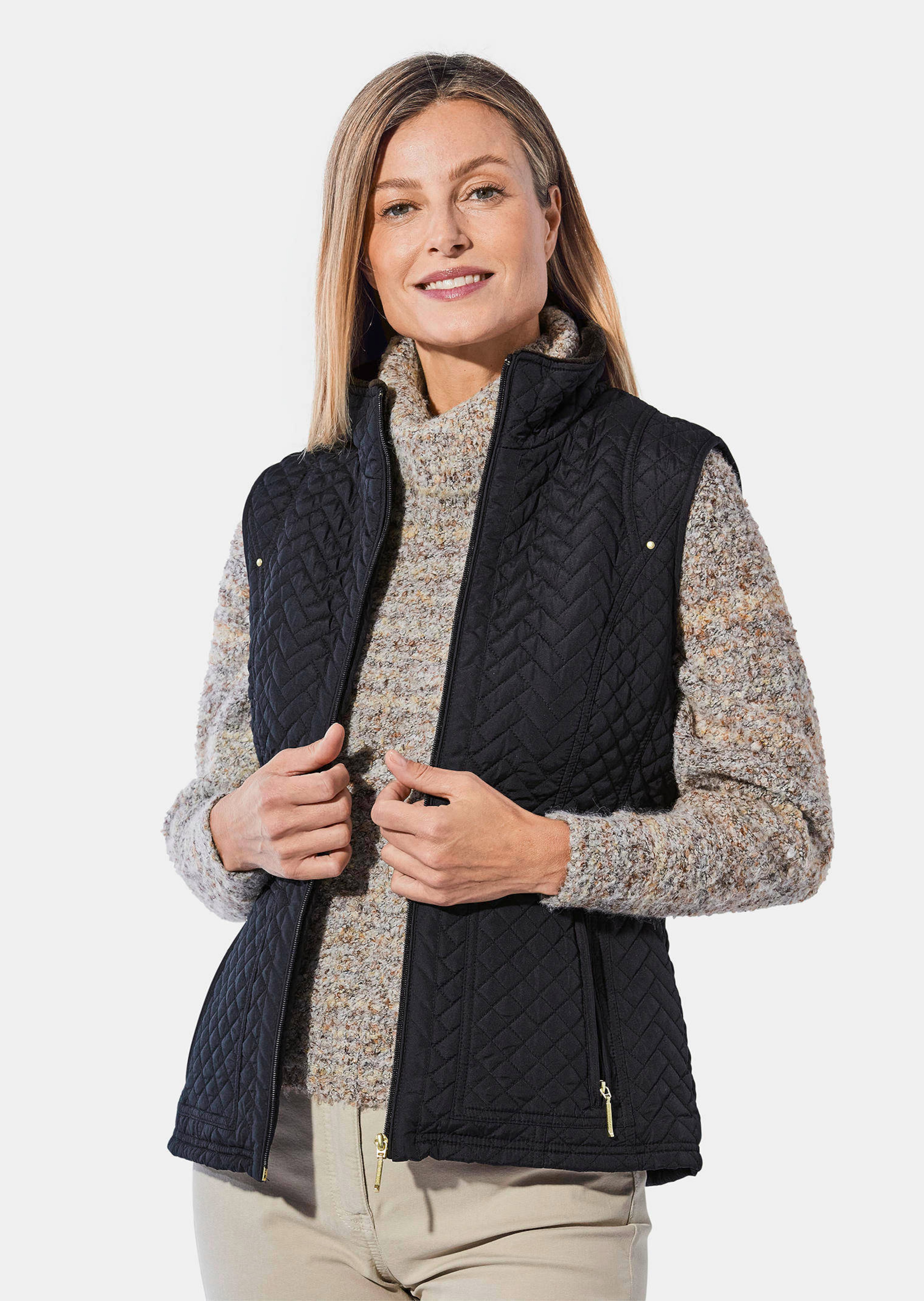 Weste in edel-sportivem Look mit attraktivem Steppdessin. Verschiedene Steppmuster – von Zickzack bis Raute – sorgen für eine raffinierte Optik. Wiener Nähte verhelfen zudem zu einer schlanken Linie. Praktisch und stilvoll zugleich sind die Eingrifftaschen mit Reißverschluss, die die Hände warm halten und Ihre Wertsachen sicher verwahren. Mit Stehkragen und Reißverschluss. Ein verstecktes Highlight hat die Weste noch zu bieten: Sie ist mit weichem Plüsch gefüttert und hält so kuschelig warm. Dieses Modell fällt eine Nummer kleiner aus. Bitte bestellen Sie die Weste eine Nummer größer als gewohnt.