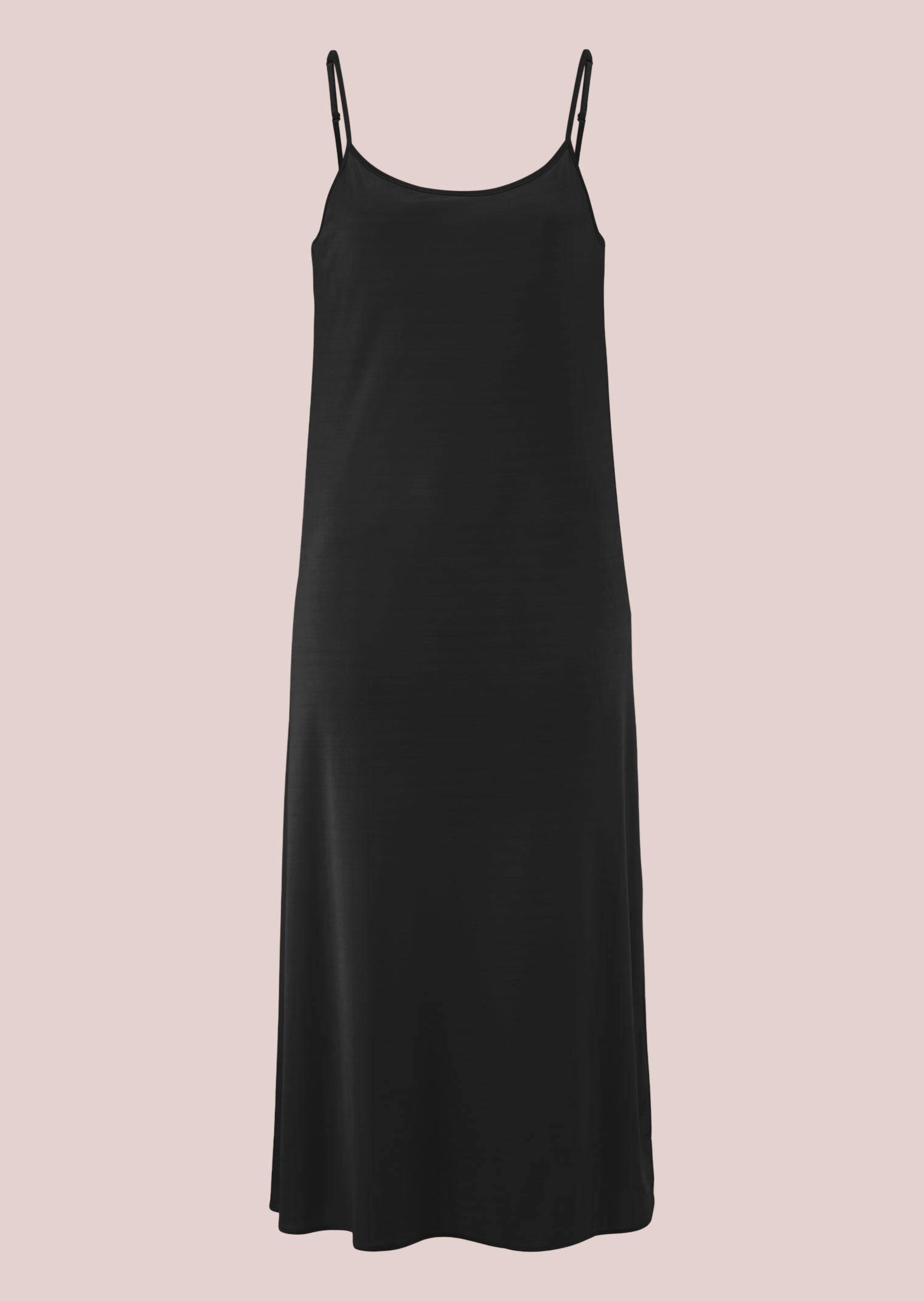 NINA VON C. -alusmekko säädettävillä spagettiolkaimilla luo sulavan siluetin ja istuu pehmeästi vartalolle. Sivuhalkiot tuovat malliin hillittyä eleganssia, ja materiaali laskeutuu kevyesti ja pehmeästi ihoa vasten. Helppohoitoinen ja tyylikäs, monikäyttöinen alusmekko.