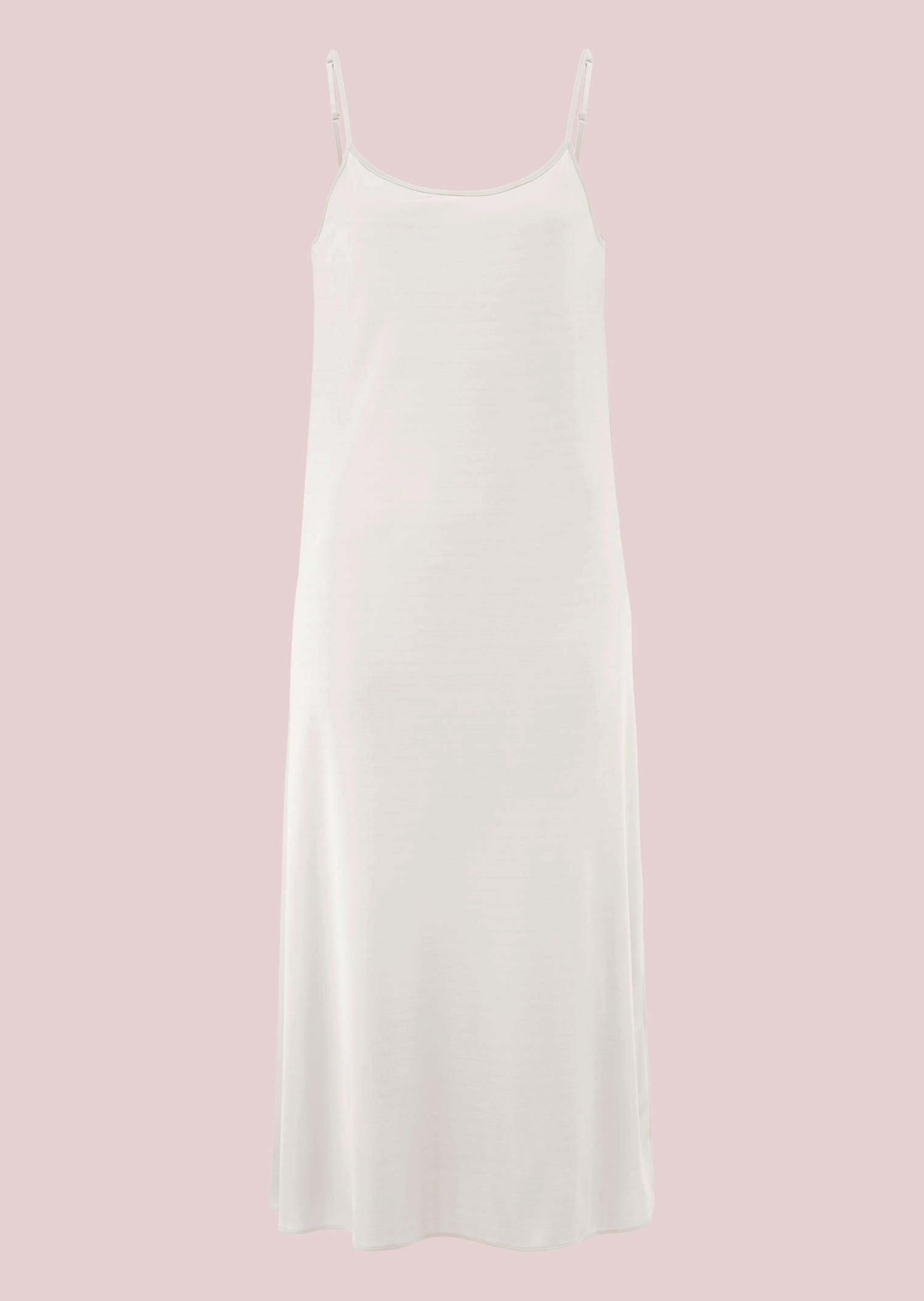 NINA VON C. -alusmekko säädettävillä spagettiolkaimilla luo sulavan siluetin ja istuu pehmeästi vartalolle. Sivuhalkiot tuovat malliin hillittyä eleganssia, ja materiaali laskeutuu kevyesti ja pehmeästi ihoa vasten. Helppohoitoinen ja tyylikäs, monikäyttöinen alusmekko.