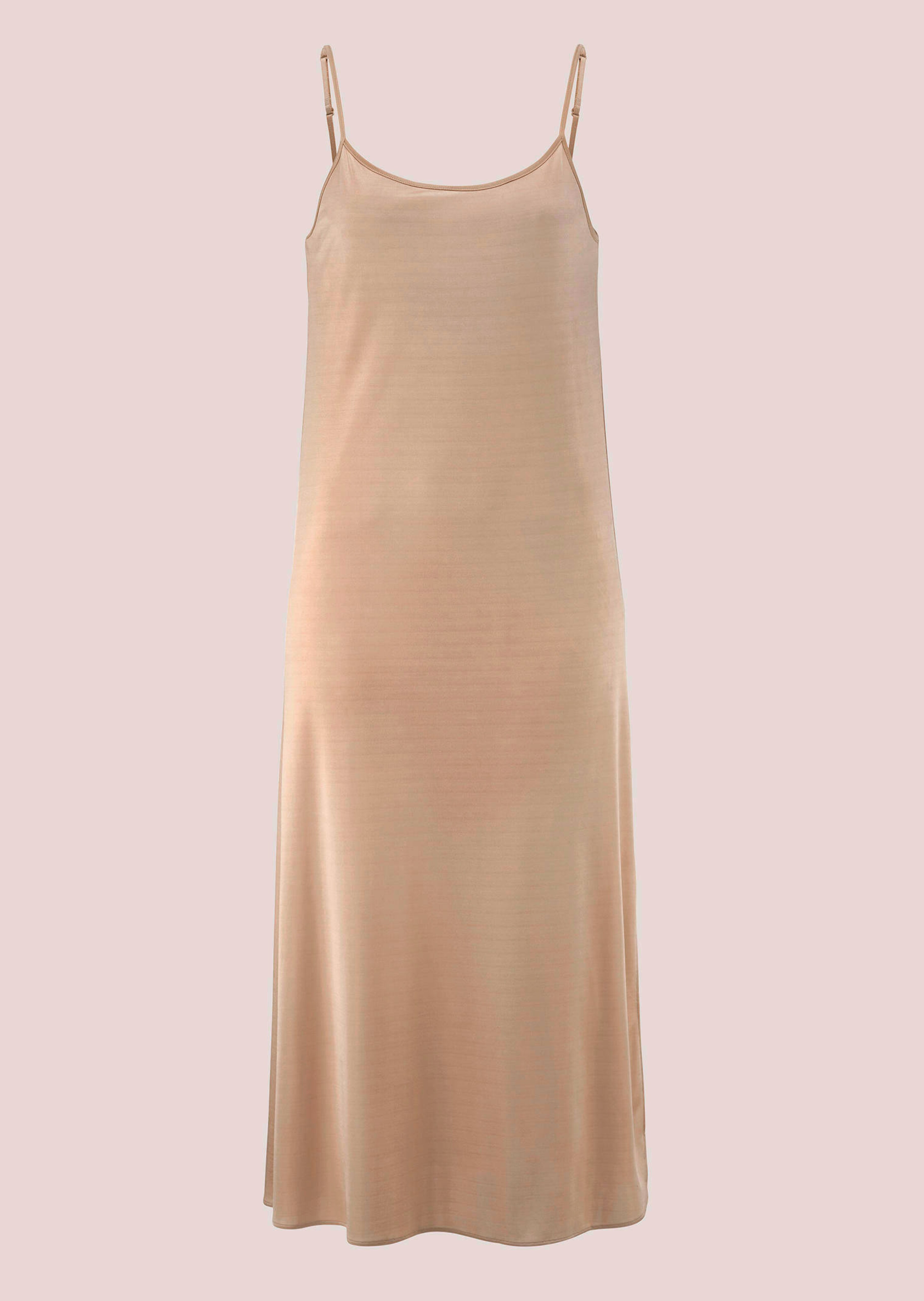 NINA VON C. -alusmekko säädettävillä spagettiolkaimilla luo sulavan siluetin ja istuu pehmeästi vartalolle. Sivuhalkiot tuovat malliin hillittyä eleganssia, ja materiaali laskeutuu kevyesti ja pehmeästi ihoa vasten. Helppohoitoinen ja tyylikäs, monikäyttöinen alusmekko.