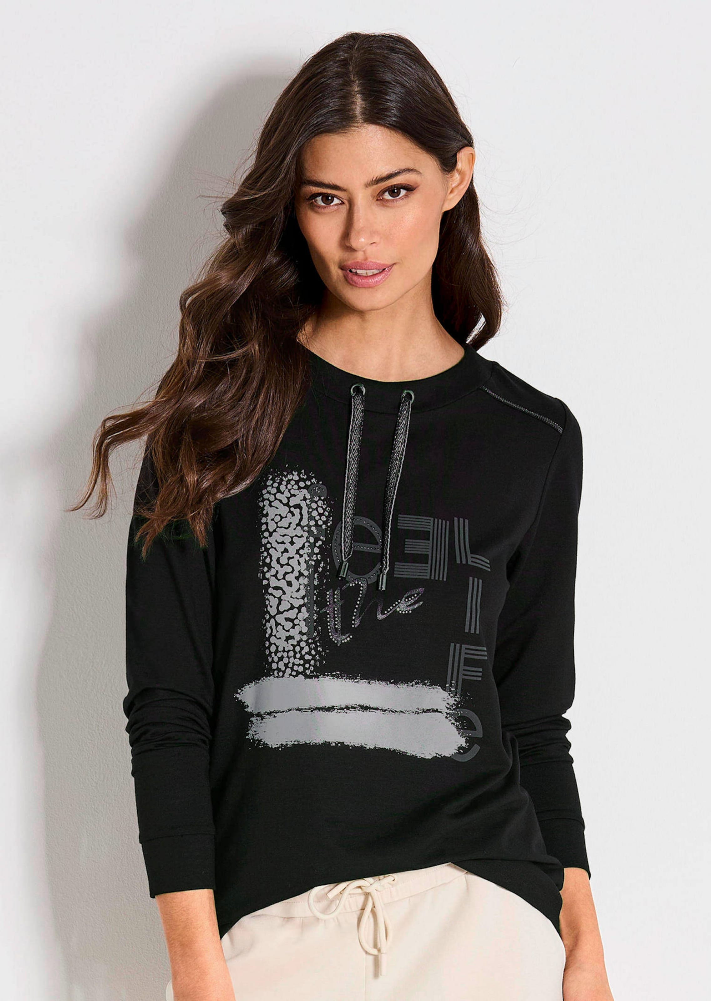 Collegepaita ihoystävällistä viskoosijerseytä. Etupuolen näyttävä hopeafolio-printti kimaltelevilla strasseilla tekee vaikutuksen. Kiiltävä hopealanka korostaa pystykauluksen solmimisnauhaa kauniisti. Olkapäillä koristeelliset tikkaukset. Rento istuvuus, suora helma ja pitkien hihojen resorit tekevät tästä paidasta todellisen joka vapaa-ajan lookin katseenvangitsijan. Pituus noin 65 cm koossa 46, noin 61 cm koossa 23.