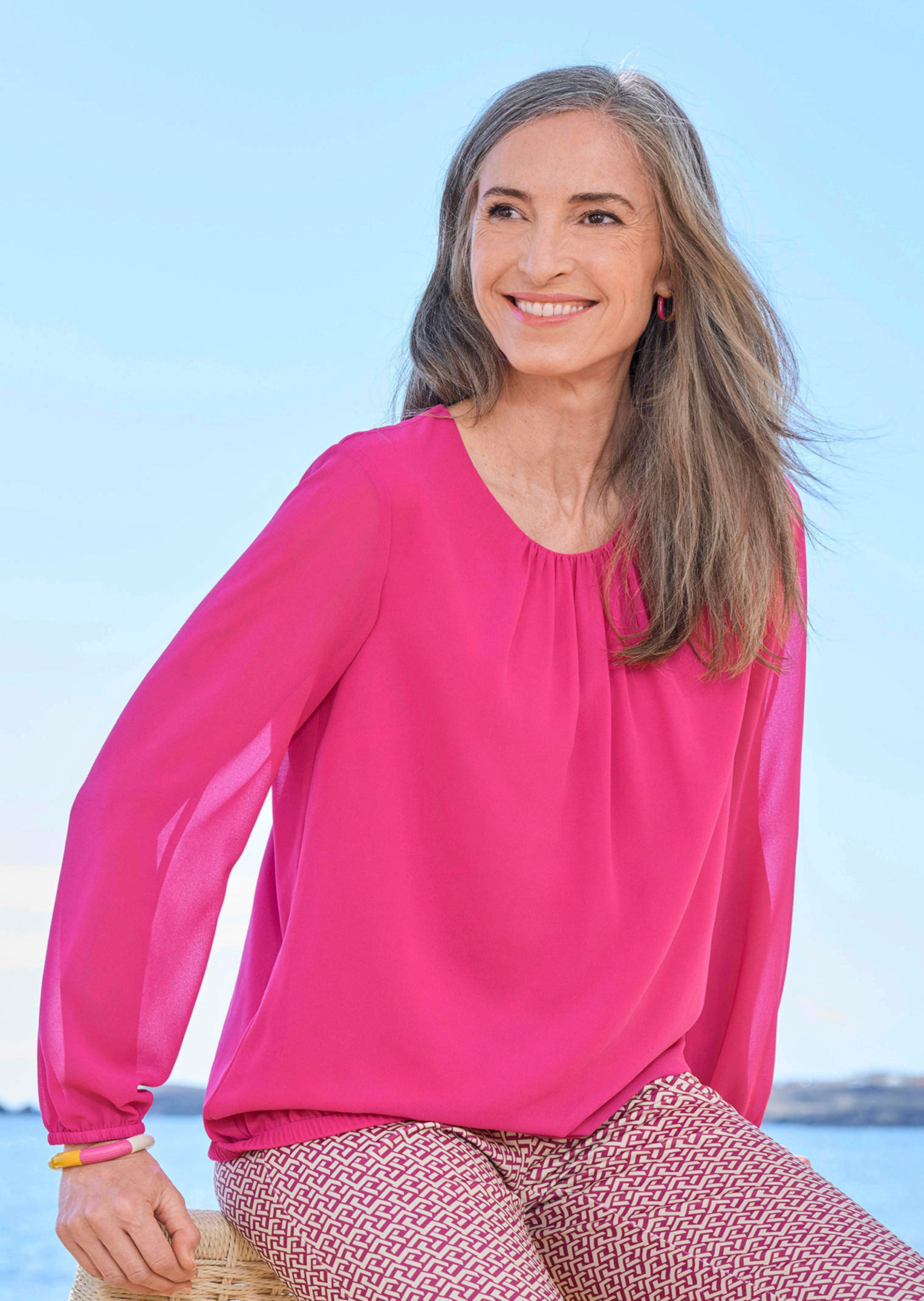 Pusero kevyttä sifonkia, joka on edestä ja takaa vuorattu läpikuultamattomaksi jerseykankaalla. Pyöreän pääntien pienet laskokset antavat kauniin laskeutuvuuden. Pitkiä, hieman läpikuultavia hihoja ja helmaa voi säätää pituudeltaan mukavasti joustavien reunusten ansiosta. Ajaton malli, imarteleva leikkaus – erinomainen valinta myös juhlavampiin tilaisuuksiin! Pituus n. 69 cm koossa 46, n. 65 cm koossa 23.