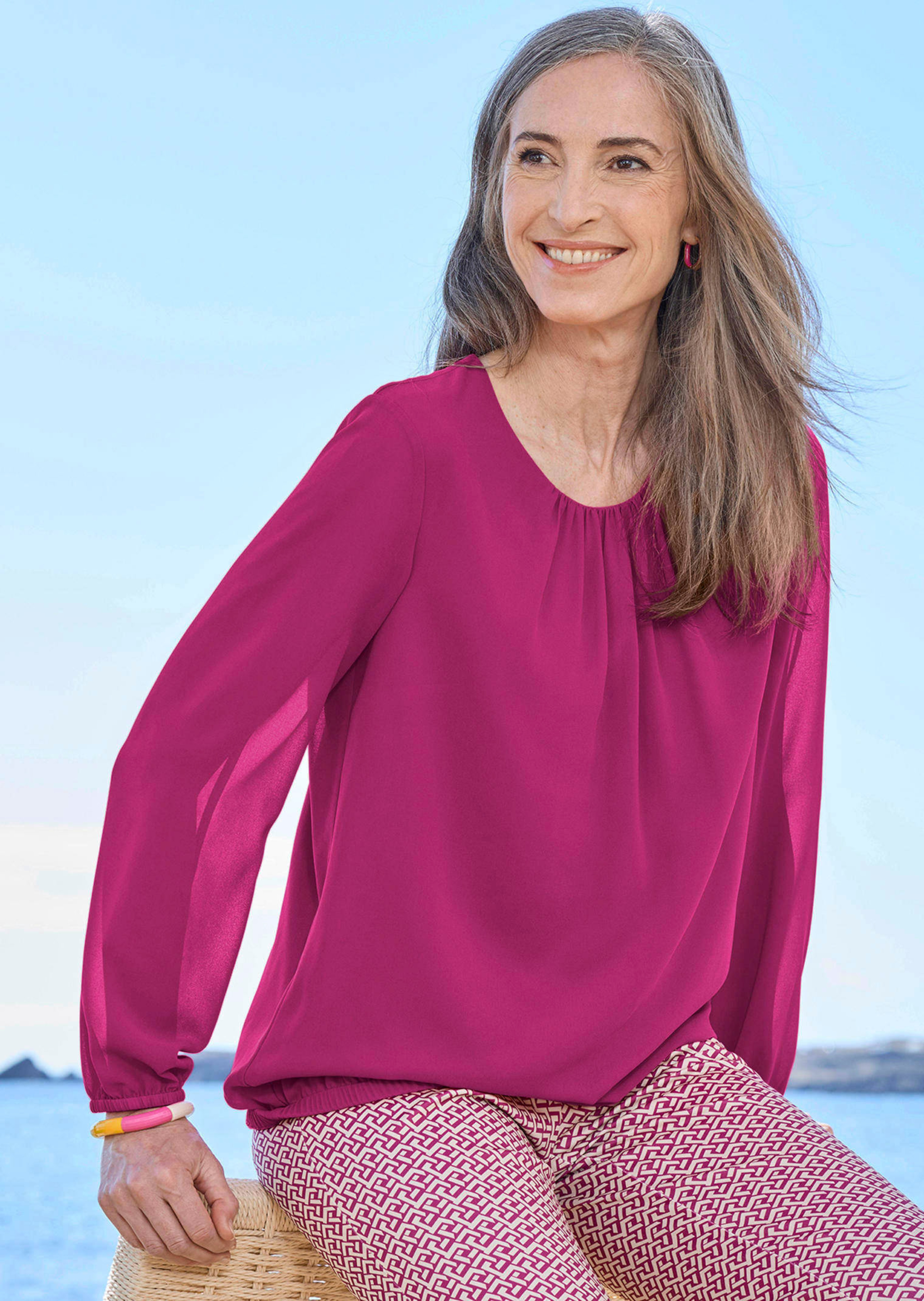 Pusero kevyttä sifonkia, joka on edestä ja takaa vuorattu läpikuultamattomaksi jerseykankaalla. Pyöreän pääntien pienet laskokset antavat kauniin laskeutuvuuden. Pitkiä, hieman läpikuultavia hihoja ja helmaa voi säätää pituudeltaan mukavasti joustavien reunusten ansiosta. Ajaton malli, imarteleva leikkaus – erinomainen valinta myös juhlavampiin tilaisuuksiin! Pituus n. 69 cm koossa 46, n. 65 cm koossa 23.