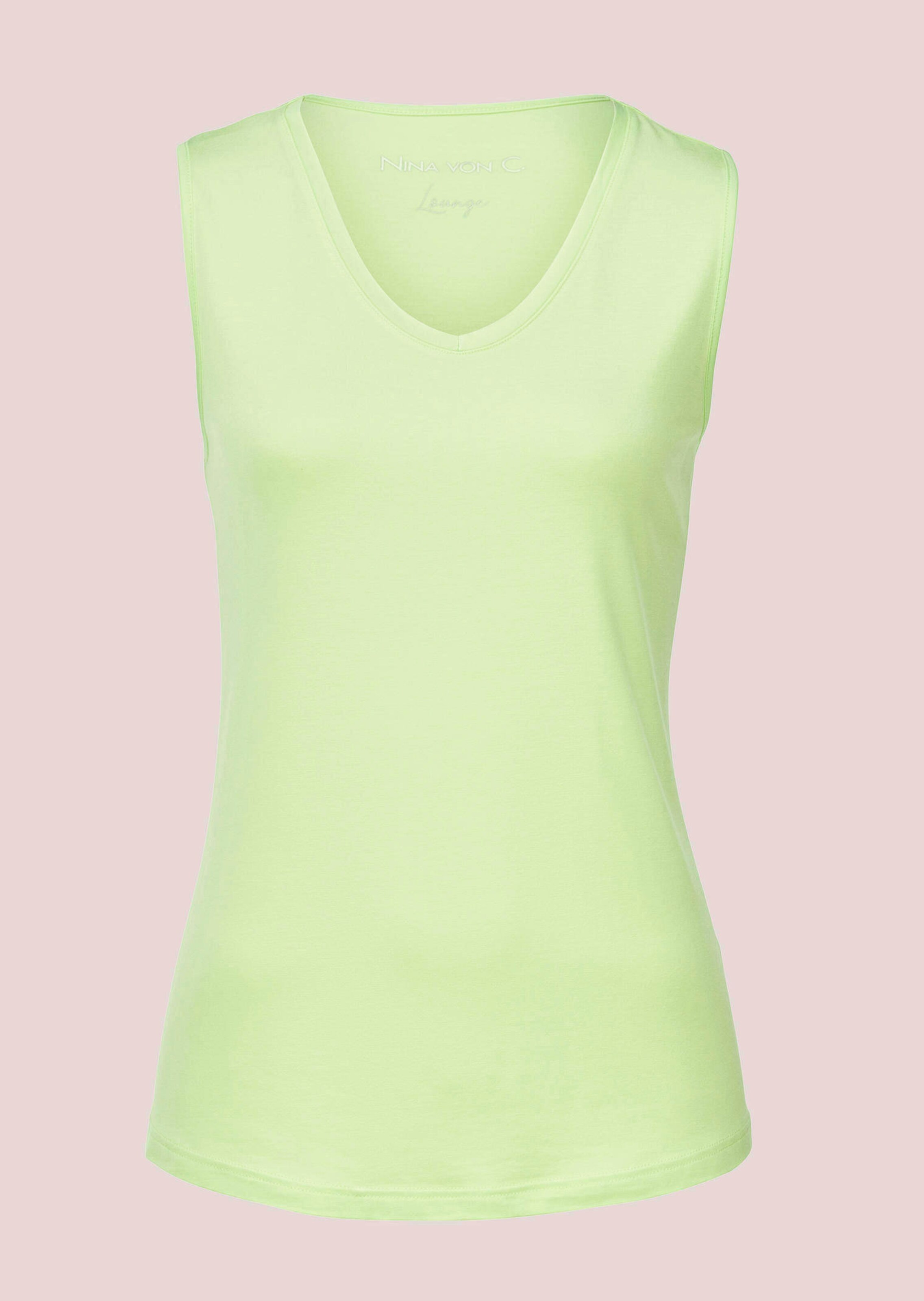 NINA VON C:n hihaton toppi on puuvilla-modaalisekoitetta, joka tuntuu pehmeältä ja miellyttävältä iholla. Hieno jerseykangas säilyttää muotonsa, ja tereillä viimeistelty V-pääntie ja hiha-aukot antavat naisellista ilmettä. Suora, sulavasti laskeutuva malli tuntuu mukavalta yllä ja näyttää ajattoman rennolta.
