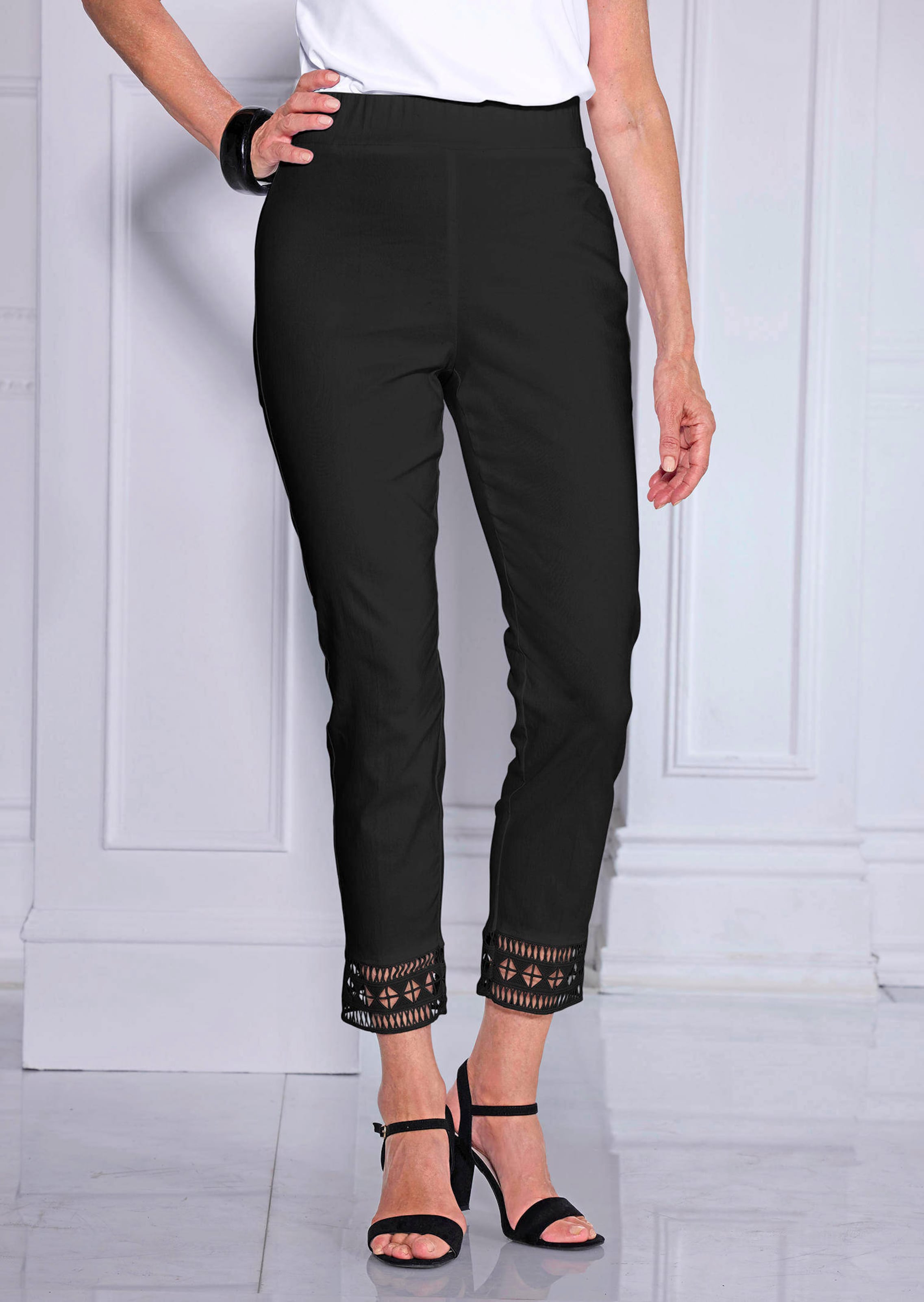 LOUISA-housut, joissa sileä, täysin joustava vyötärönauha, eivät ole vain tyylikkäät, vaan myös mukavat. Leveä vyötärönauha ja joustava, helppohoitoinen materiaali varmistavat tämän. Silitetyt taitokset edessä ja takana luovat tyylikkäitä aksentteja Lahkeensuissa kaunis pitsireuna. Kauden kauneimmat katseenvangitsijat! Lahkeensuun ympärys noin 36 cm. Kapeat lahkeet.