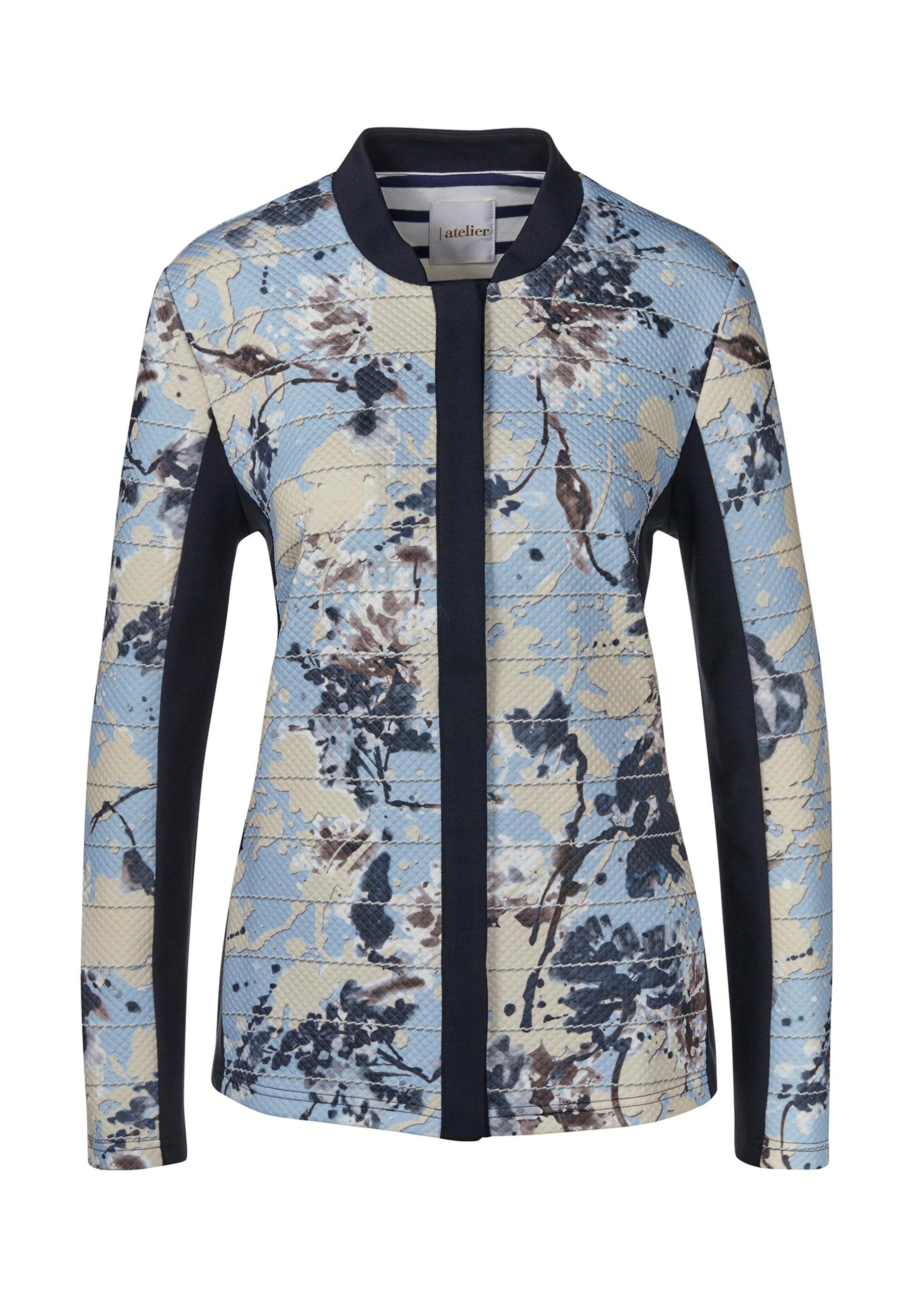 Painokuvioitu jakku laadukasta kuvioiden ja materiaalien sekoitetta. Eläväpintaisessa jerseykankaassa on raikas kukkapainatus. Sopusoinnussa siihen on väriin sävytetyt sivuosuudet, kaulus ja nappilista tiheäkudoksisesta jerseystä. Laadukas sisäpuolen työstö. Pituus 65 cm koossa 46, 61 cm koossa 23.