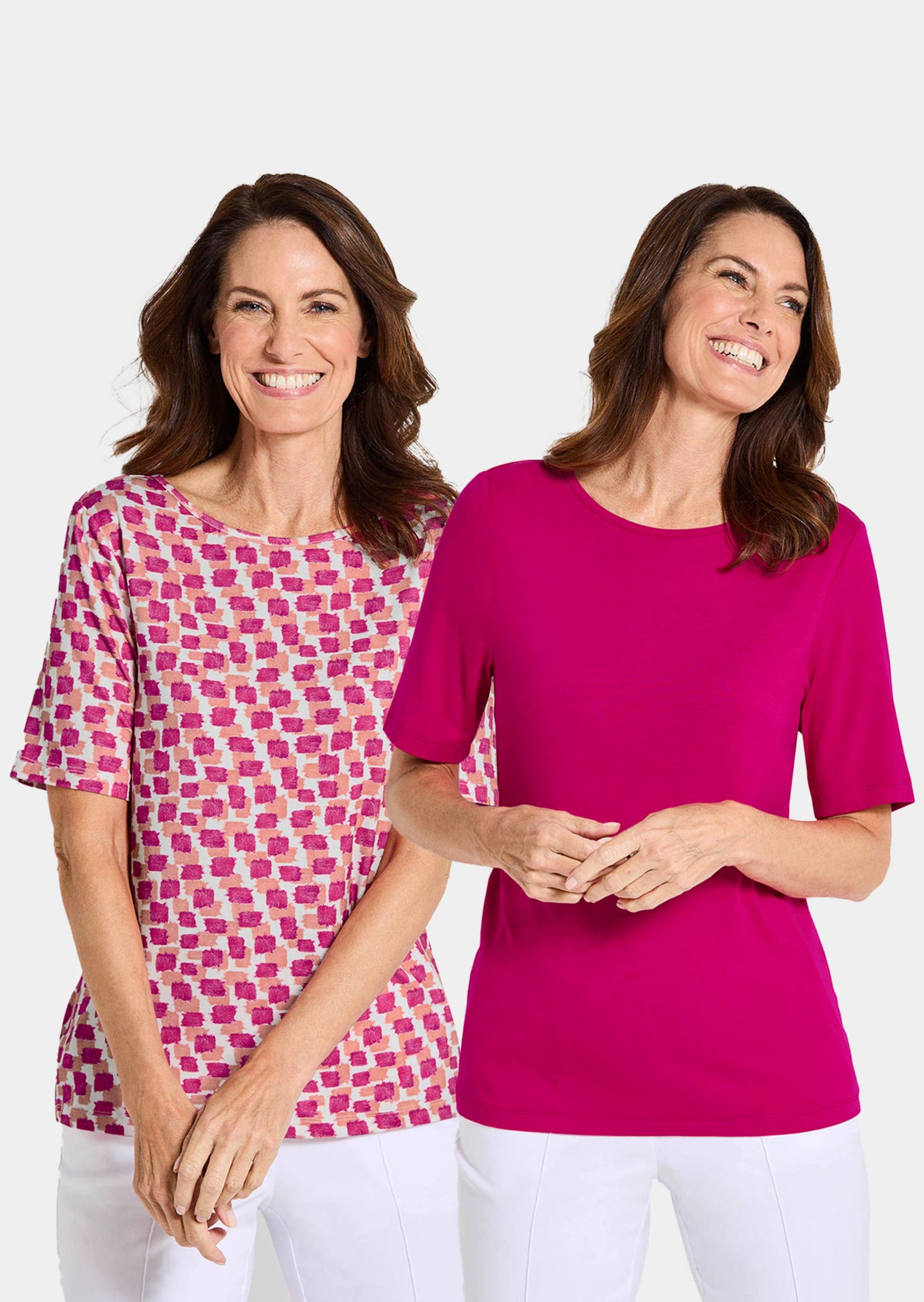 Paita tuplapakkauksena – yksivärinen paita ja kuviollinen paita, joita on helppo yhdistellä. Molemmat mallit joustavasta viskoosijerseystä tuntuvat miellyttäviltä yllä. Suora, takamuksen peittävä malli, venepääntie ja puolipitkät hihat. Pituus noin 64 cm koossa 46, noin 60 cm koossa 23.
