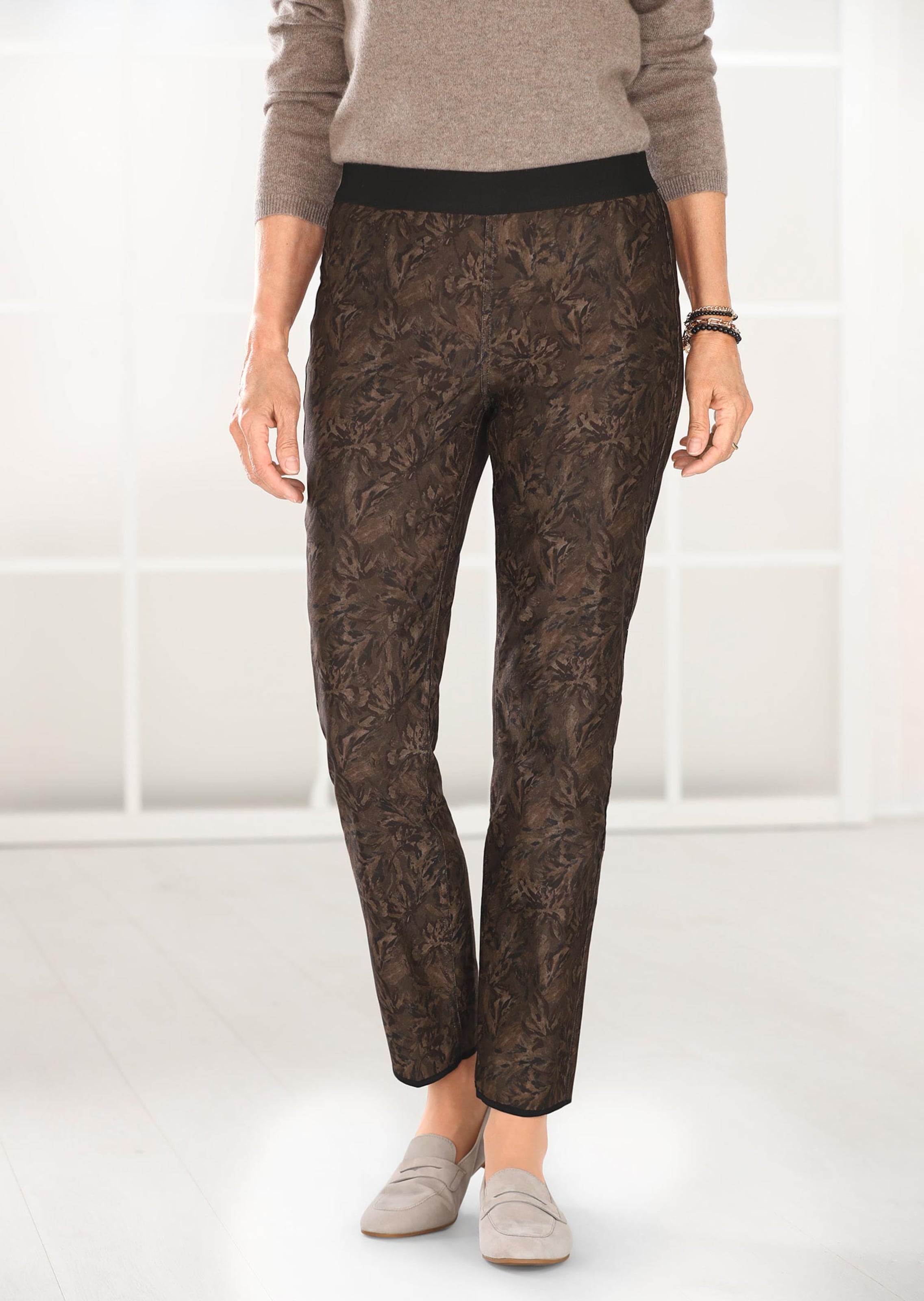 Kääntöprinttihousut, joissa kaksi eri käyttömahdollisuutta. Toisella puolen on kaunis kukkakuosi, toinen puoli on taas ajattomasti yksivärinen. Saat siis yksillä housuilla sopivaa ilmettä eri tilanteisiin. Mukavaa stretchkangasta ja pehmeä kuminauhavyötärö. Lahkeen leveys 36 cm. Kapea lahje.