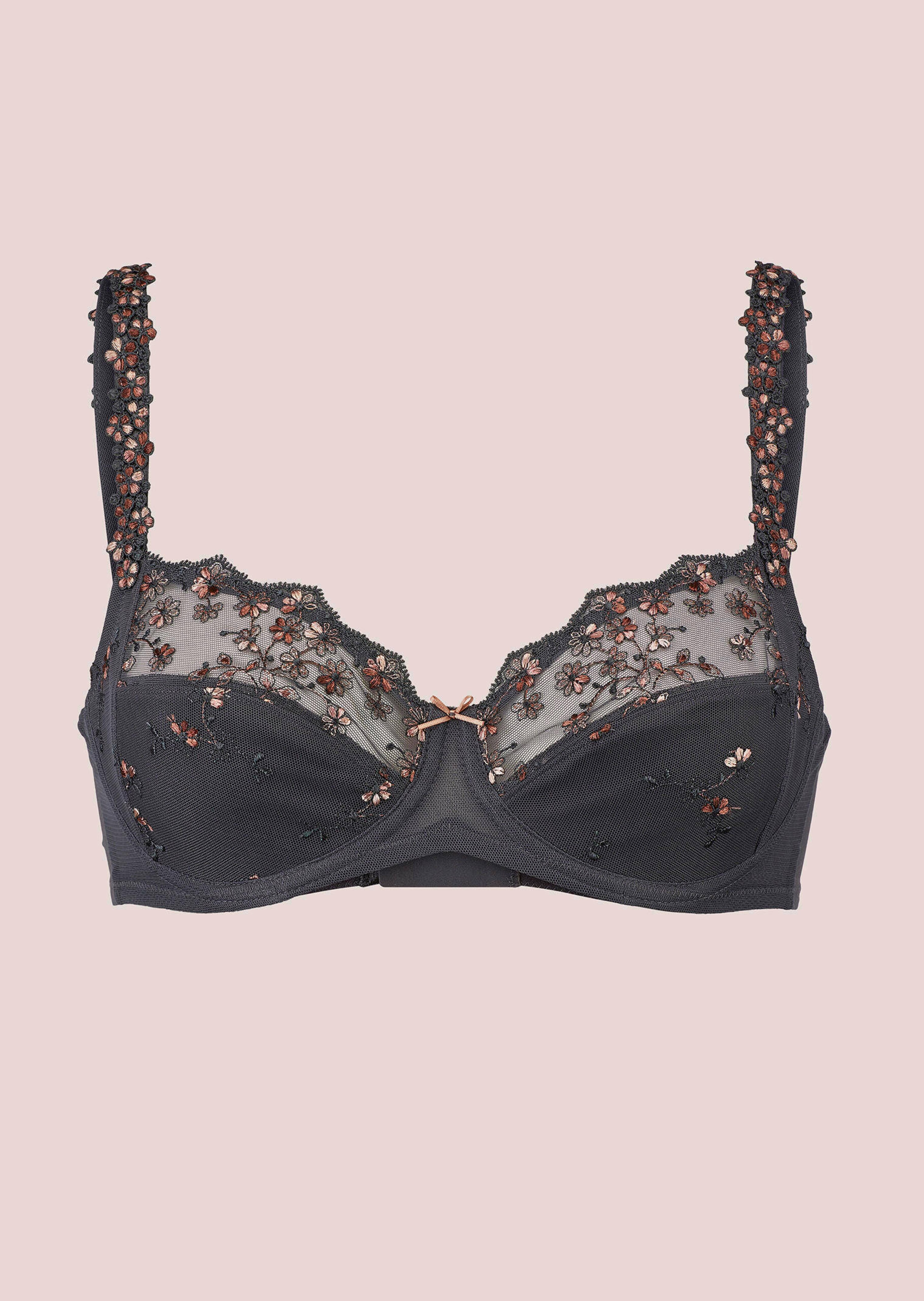 Kaarituelliset MEY-rintaliivit tarjoavat hyvän istuvuuden ja naisellisia yksityiskohtia. Muotoon ommellut kupit antavat hyvän tuen, ja aluskupeissa on läpinäkymätön vuori. Dekolteeta korostaa herkkä kukallinen pitsi hienolla verkkokankaalla, ja takaosan säädettävät olkaimet kiiltävät hillitysti. Etuosan nauha kukallisesta pitsistä vangitsee katseita, ja kolminkertaisesti säädettävä hakaskiinnitys tuo yksilöllistä istuvuutta.