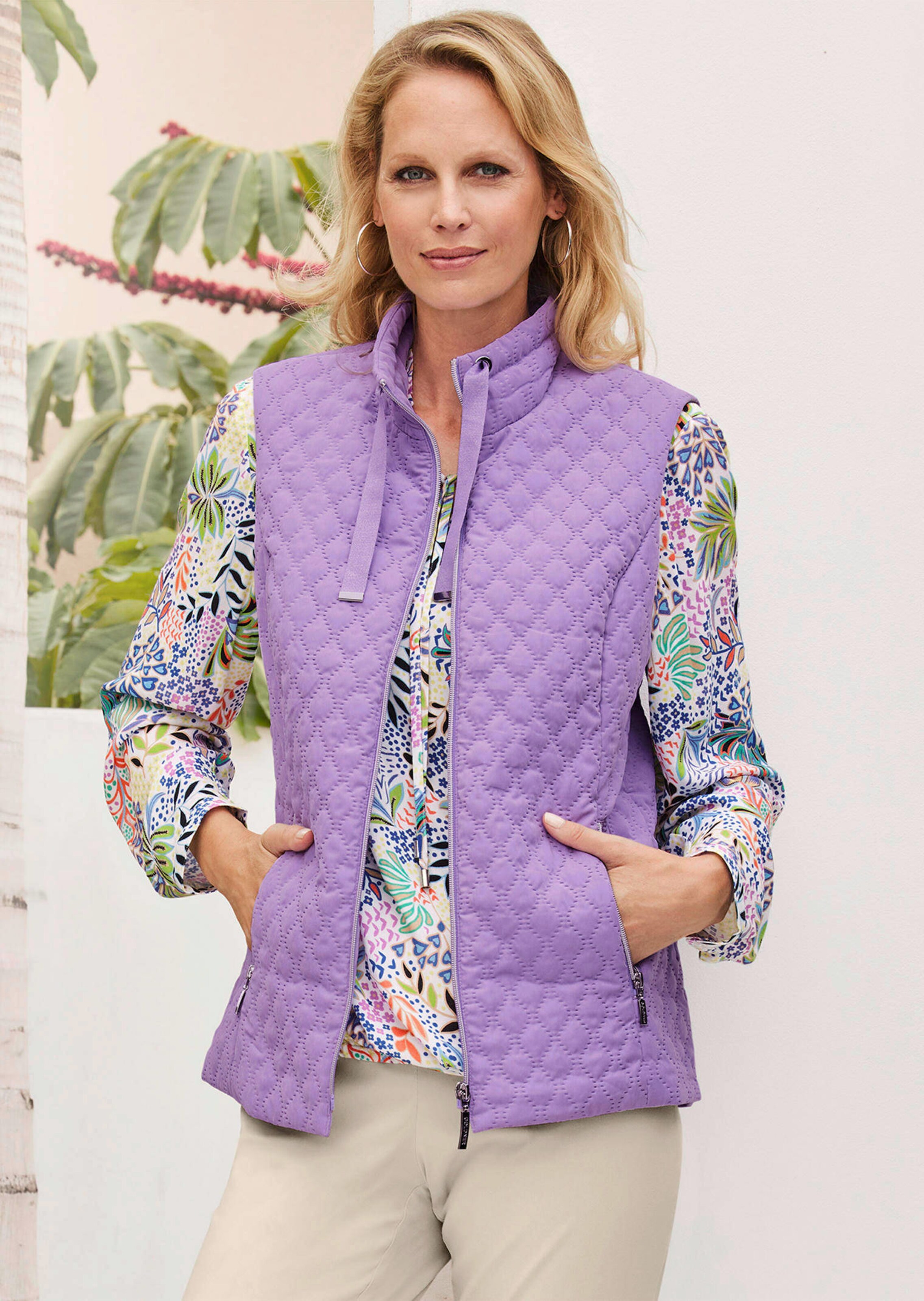 Tikkiliivissä on laadukas, huippumuodikas painatus ja persikanpehmeä tuntu. Kevyesti topattu liivi muoto-ompelein istuu nätisti päällä. Pystykauluksessa on kiiltolankaista koristenauhaa. Vetoketjulliset taskut kruunaavat sporttisen ilmeen. Pituus 66 cm koossa 46, 62 cm koossa 23.