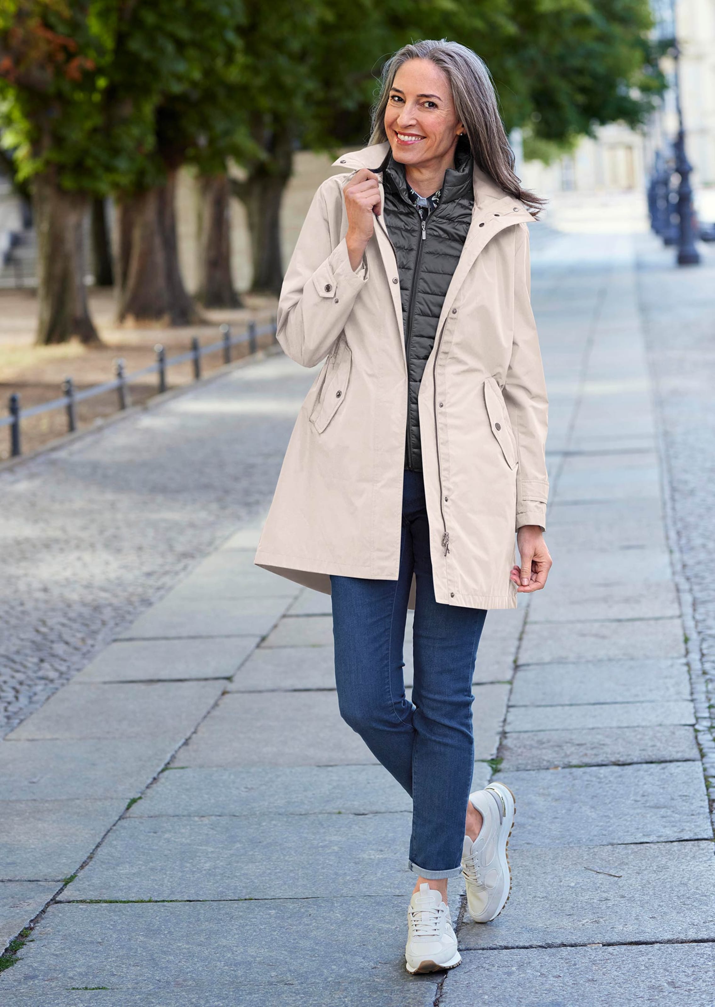 Useamman vuodenajan takki käy säähän kuin säähän. Siinä yhdistyvät takki ja irrotettava tikkiliivi, joten takkia voi käyttää kolmella eri tavalla: Kiinnitä hupullinen päällitakki ja liivi yhteen saadaksesi lämmintä suojaa kylmiin päiviin. Voit myös käyttää takkia ja liiviä erikseen. Tuulta pitävässä takissa on korkea pystykaulus, irrotettava huppu ja sisäpuolella kiristysnyöri. Tuplataskuissa on todella syvät taskupussit. Etuvetoketjun päällä on painonappilista, ja niissä on GOLDNER-logot. Takissa on laadukkaat kanttaukset ja kankaansävyistä ripsinauhaa. Ekologinen, vettä ja likaa hylkivä Bionic Finish ECO® -kyllästys on fluoritonta ja säilyttää värit ja kankaan kudonnan pidempään uudennäköisinä, saa kankaan myös kuivumaan nopeammin ja tekee takin huoltamisesta helppoa. Lisäksi kangas hengittää, pitää tuulta, kestää kulutusta ja suojaa UV-säteiltä. Pituus 90 cm koossa 46, 86 cm koossa 23.
