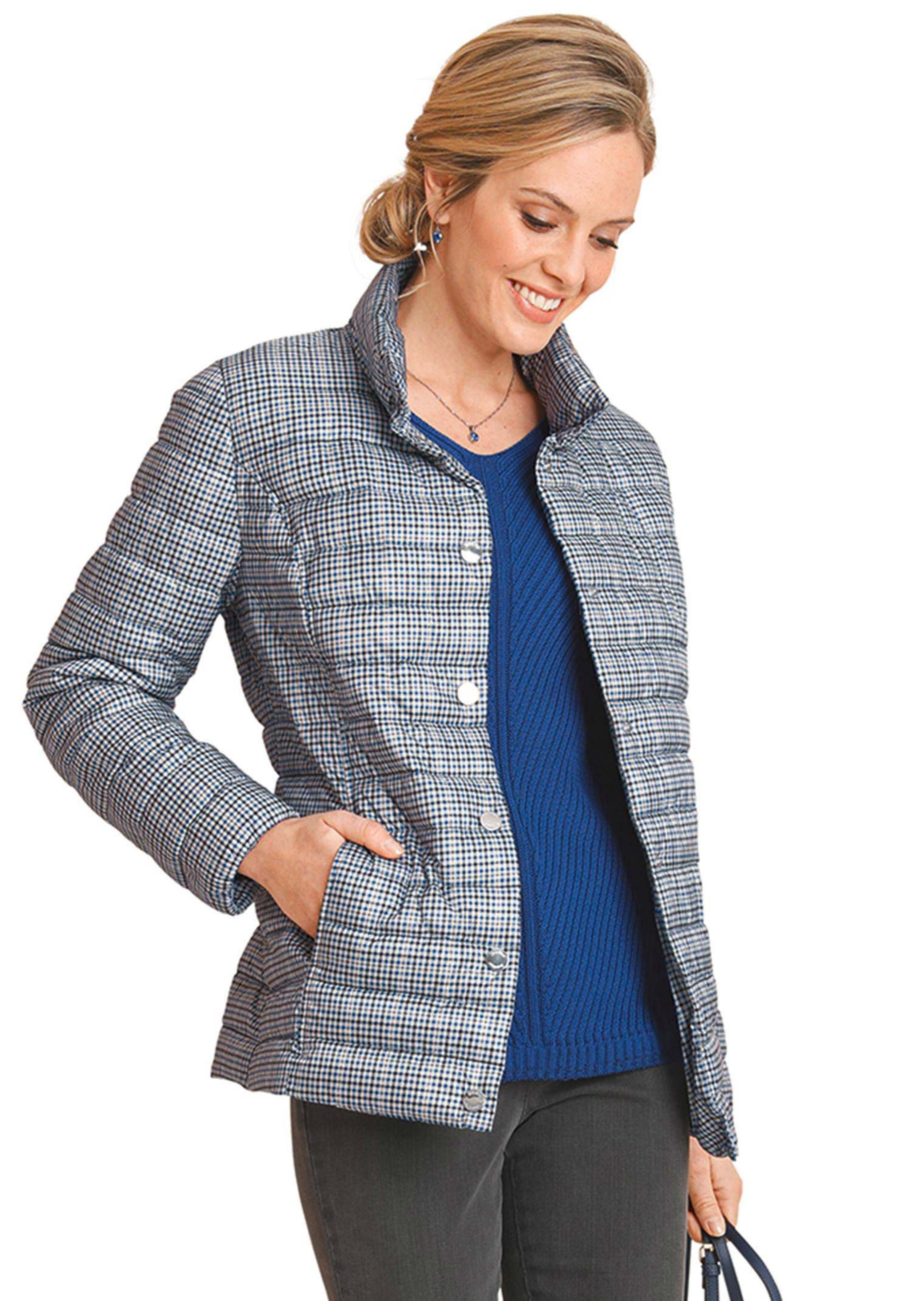 Ulkotakissa on laadukas painokuosi. Kauniina kontrastina on sisäpuolen sähkönsininen vuori. Takissa on tyylikkäät, hopeanväriset somisteet, ryhtiä tuovat muoto-ompeleet, kevyt toppaus ja vuori. Edessä on painonapit, ja kaulus nousee tyylikkäästi pystyyn. Pituus 70 cm koossa 46, 66 cm koossa 23.
