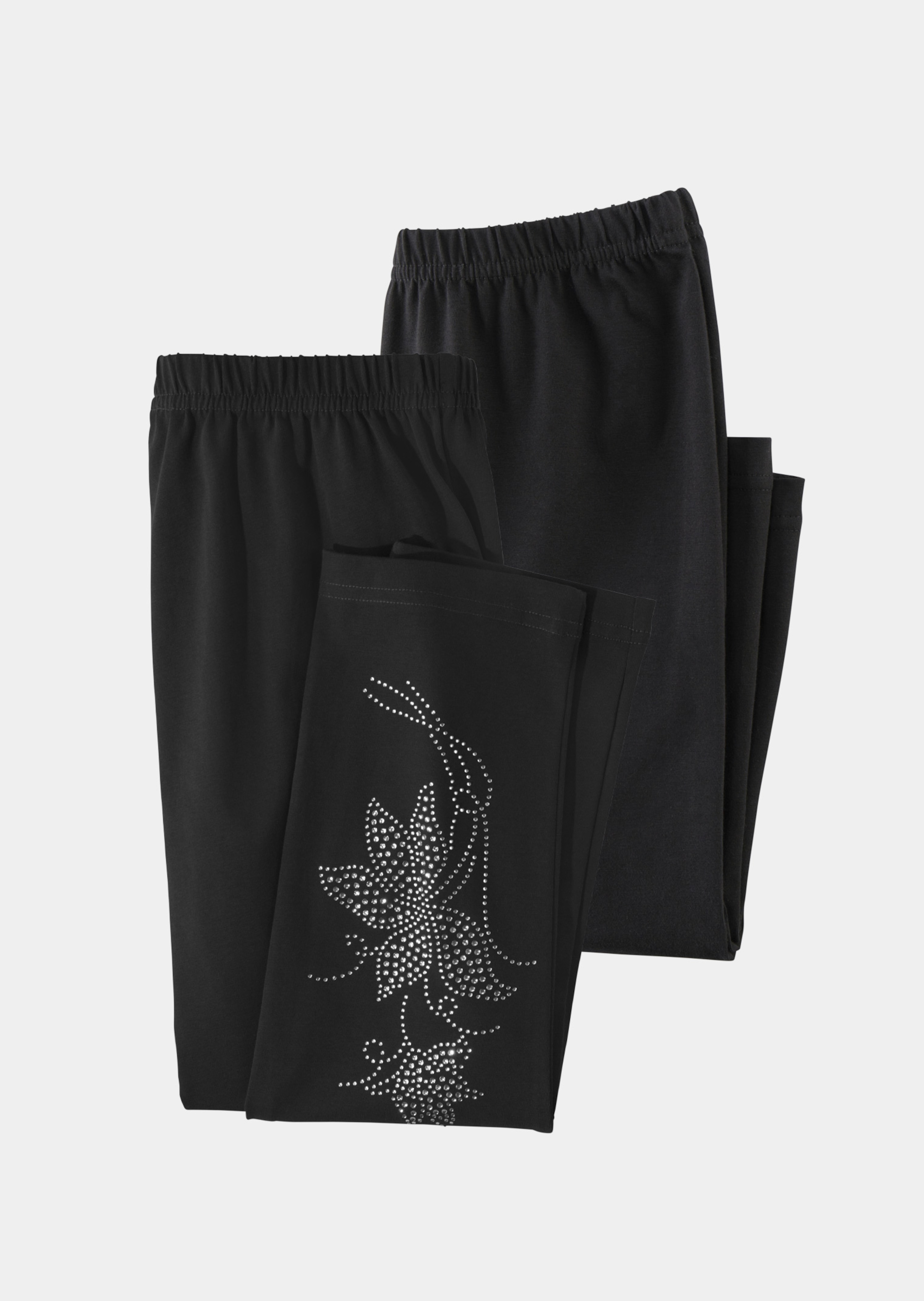Kahdet kapealahkeiset PLANTIER legginsit: toinen malli tekee vaikutuksen tyylikkäällä kimallekuviolla, kun taas toinen on yksinkertainen, yksivärinen malli arkeen. Pehmeästä puuvillasta ja elastaanista valmistetut legginsit ovat joustavat ja pysyvät hyvin muodossaan. Leveä, täysin joustava vyötärönauha ei paina ihoa.