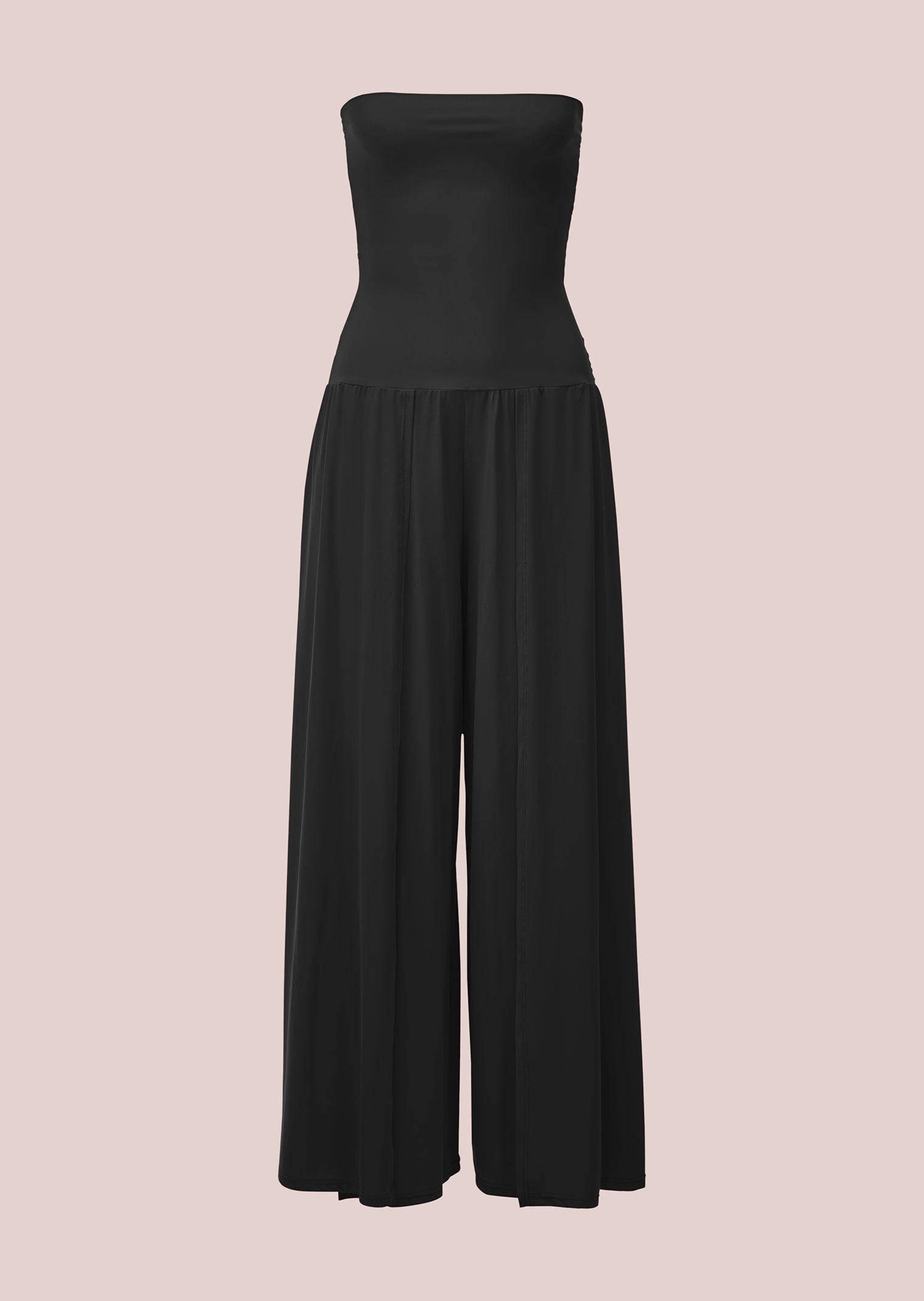 Monikäyttöistä haalaria voi käyttää yksiosaisena asuna tai housuina. Leveä, taitettava bandeau-toppi on helppo sujauttaa päälle. Pitkät ja leveät lahkeet, joissa on edessä halkio, antavat mallille hienostuneen ilmeen. Pehmeää, laadukasta materiaalia oleva haalari on monikäyttöinen kesäinen suosikki.
