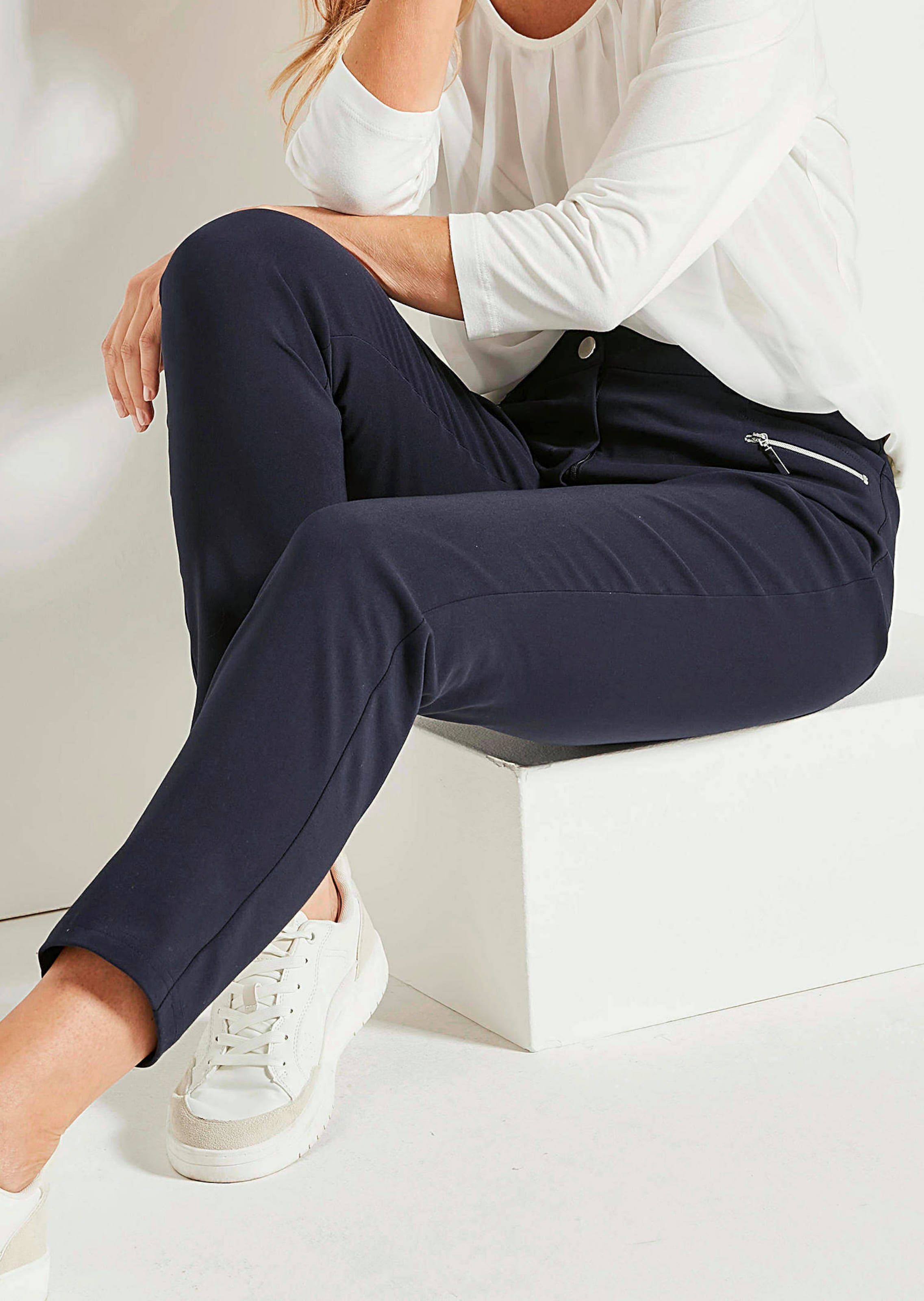 Muotoilevat BELLA-housut, joissa on vahvistettu vyötärönauha ja vyölenkit. Nerokkaan sisäpuolen power-mesh viimeistelyn ansiosta housut takaavat litteän vatsan. Erittäin kapea malli kapeilla lahkeilla muotoilee elegantin vartalon. Housut ovat erittäin mukavat joustavan puuvillasekoiteen ansiosta. Sivutaskut, koristevetoketjulliset taskut ja takataskut. Saumat on kauniisti ommeltu, ja vetoketjut sekä napit ovat metallinhohtoisia. Lahkeen leveys n. 32 cm. Erittäin kapeat lahkeet.