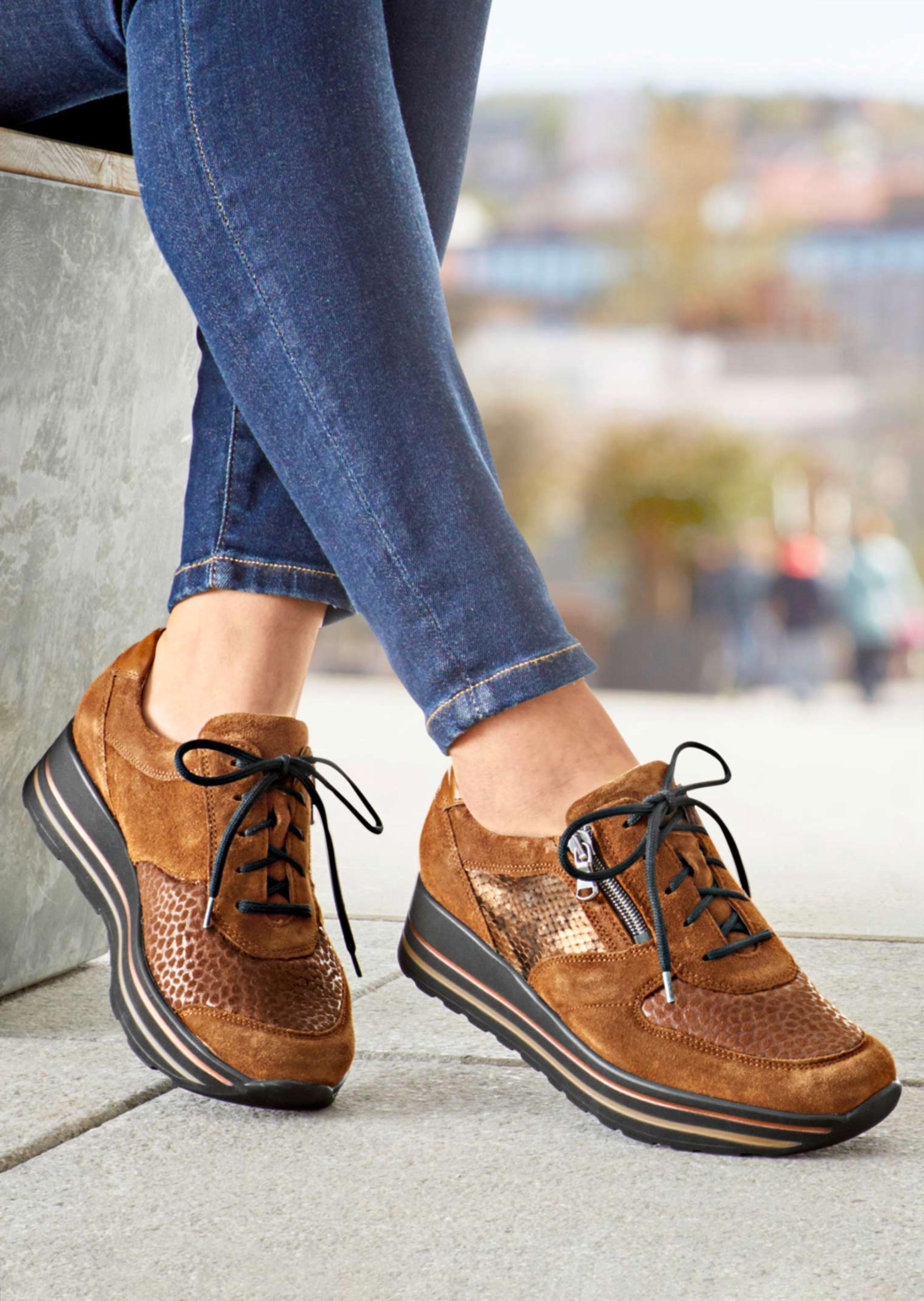 Nahkaiset nauhakengät H-LANA merkiltä WALDLÄUFER ovat jalassa todella mukavat. Pehmeää mokkaa villieläinsomistein. Sivuvetoketju helpottaa kenkien jalkaan laittoa. Miellyttävä tekstiilivuori ja vaihdettava irtopohjallinen. PU-ulkopohjassa niveliä suojaavat ilmatyynyt.