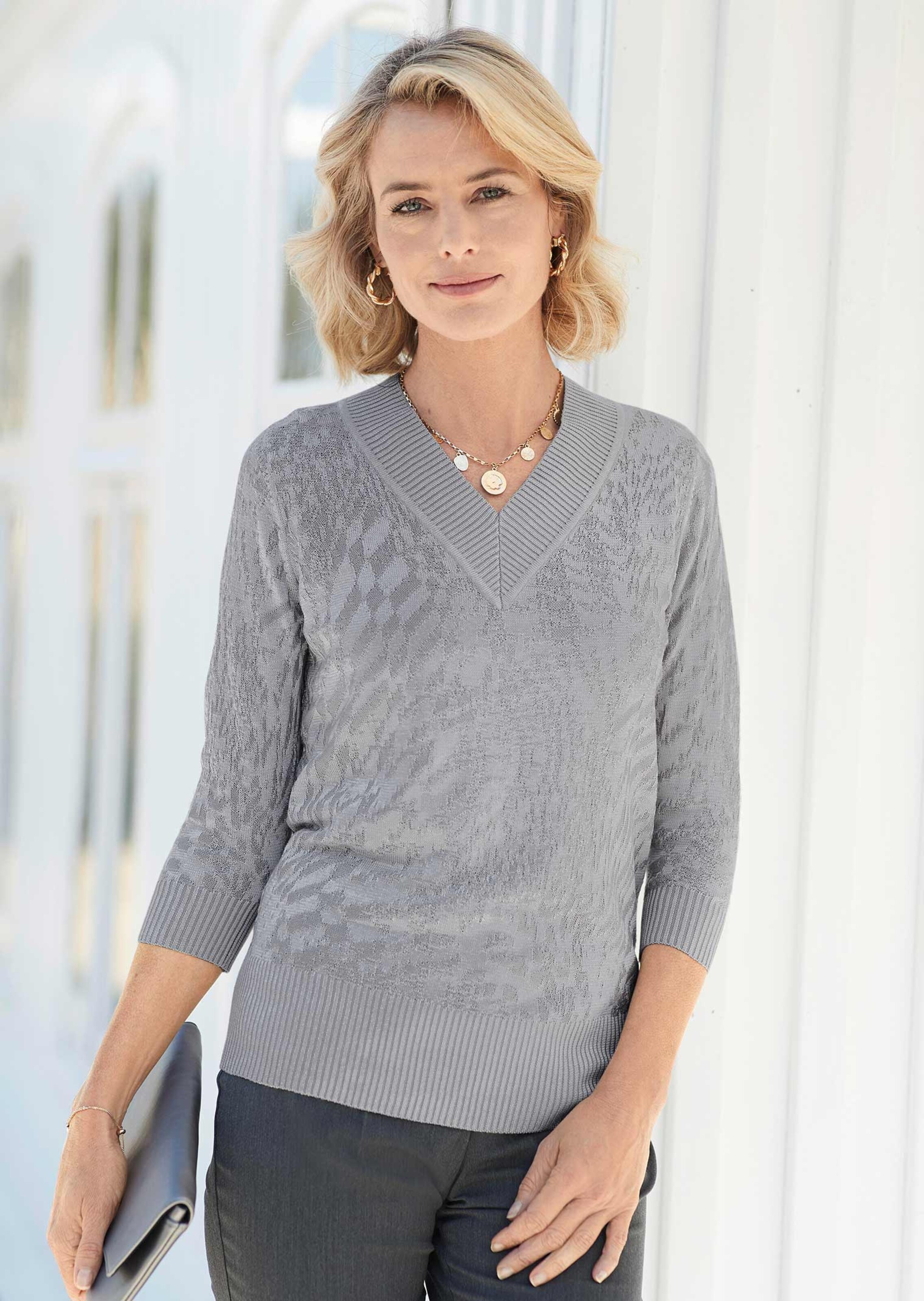 V-pääntieneuleessa on kiehtovaa rakenneneulosta. Päällystetty lanka hohtaa hillitysti, ja resorit ovat leveä ribbineulosta. Helppohoitoista lankaa ja 3/4-hihat. Pituus 67 cm koossa 46, 63 cm koossa 23.