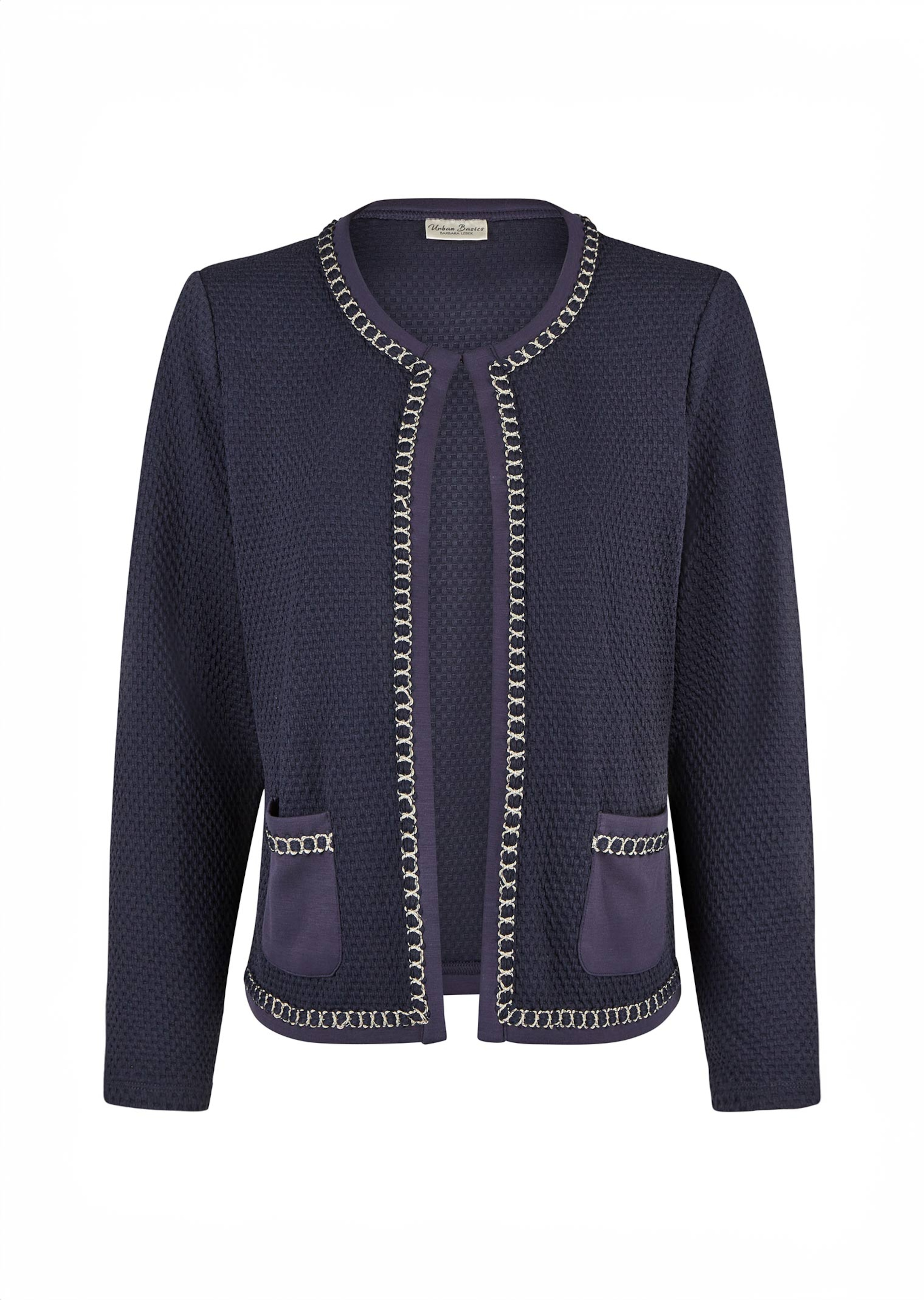 BARBARA LEBEKin neuletakki vohvelikuviolla. Erityisen pehmeää, teksturoitua jerseykangasta somistavat pääntien ja etuosan koristereunukset. Avoin, vuoraamaton malli kahdella päällitaskulla, pääntiessä on hakaskiinnitys. Elegantti neuletakki, joka näyttää tyylikkäältä mekkojen tai hienojen housujen kanssa. Pituus noin 62 cm koossa 46.