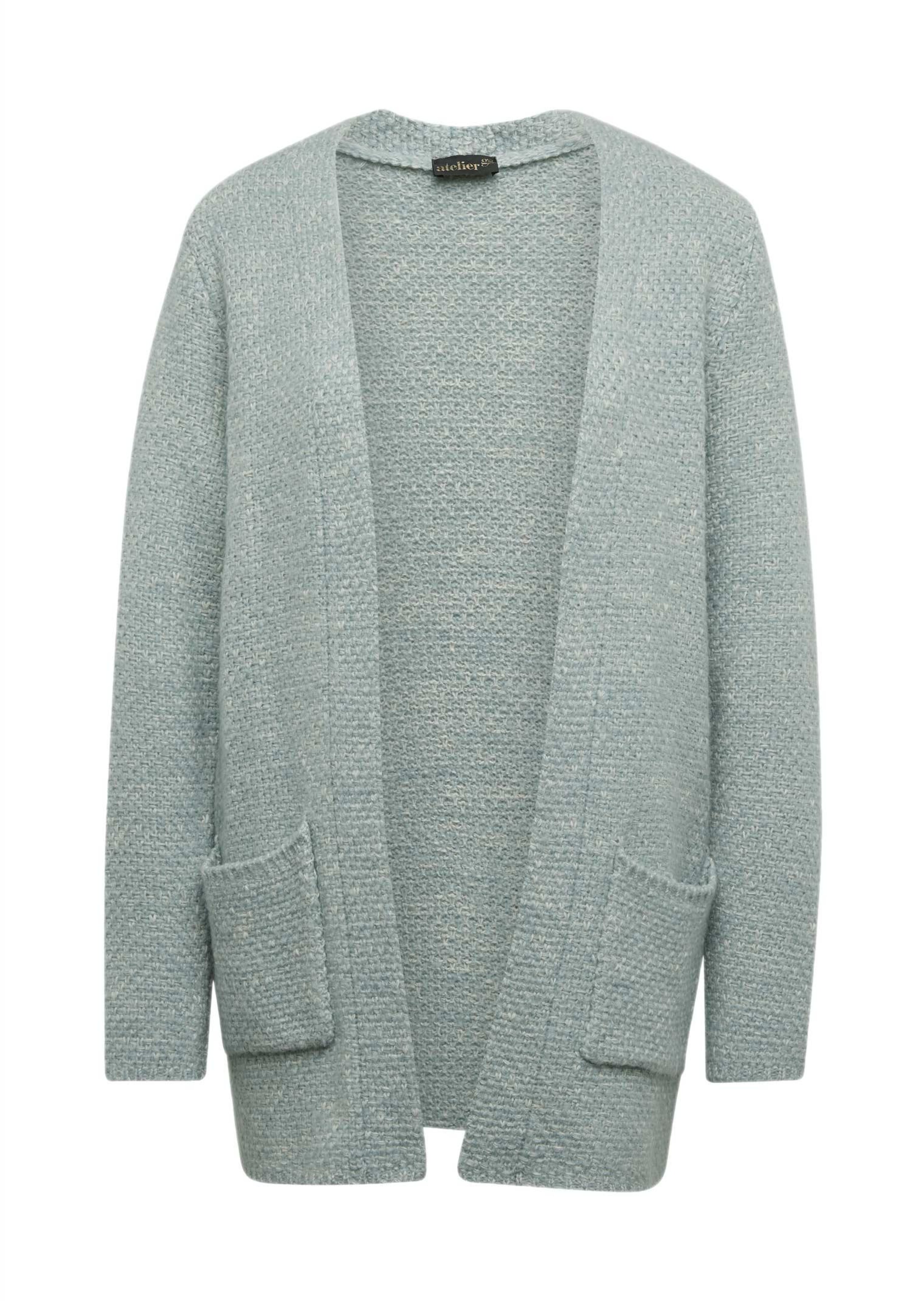 Neuletakissa on rento malli. Laadukas kuvioneulos antaa sille kivaa ilmettä. Saalikaulus pidentää ja neuletakki jää edestä avoimeksi. Päällitaskut ja kapeat ribbiresorit. Neuletakki on miellyttävää, pehmeää sekoitetta puuvillasta ja uudesta villasta. Pituus 76 cm koossa 46, 72 cm koossa 23.