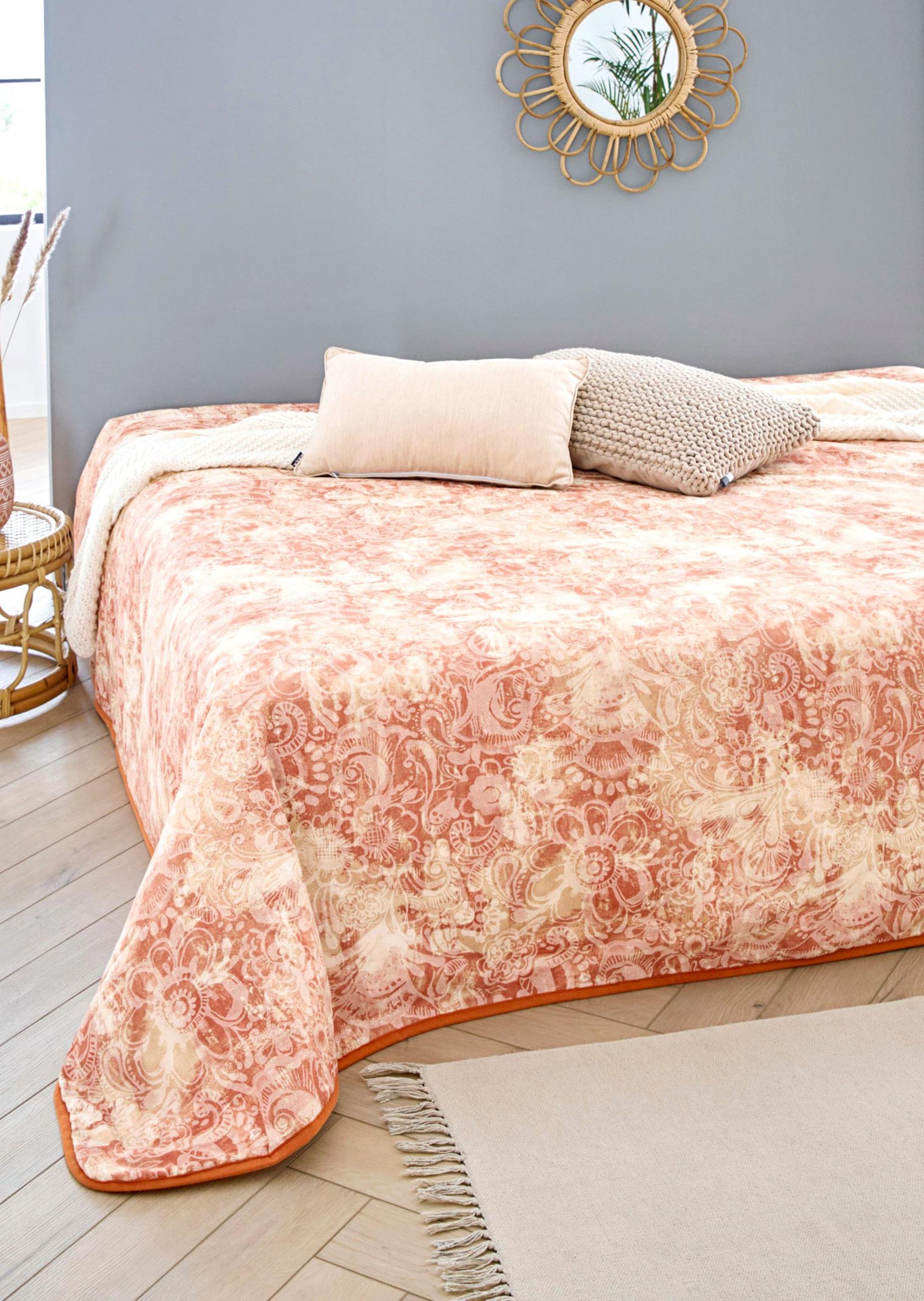 Päiväpeitto merkiltä DOHLE + MENK. Kiva kuosi, jossa kukkaornamenttia ja kukkia puuterisin pastellivärein. Reunoissa sävyyn sopiva kanttaus. Päiväpeitto on helppohoitoista, iholle lempeää materiaalia ja kevyesti topattu.