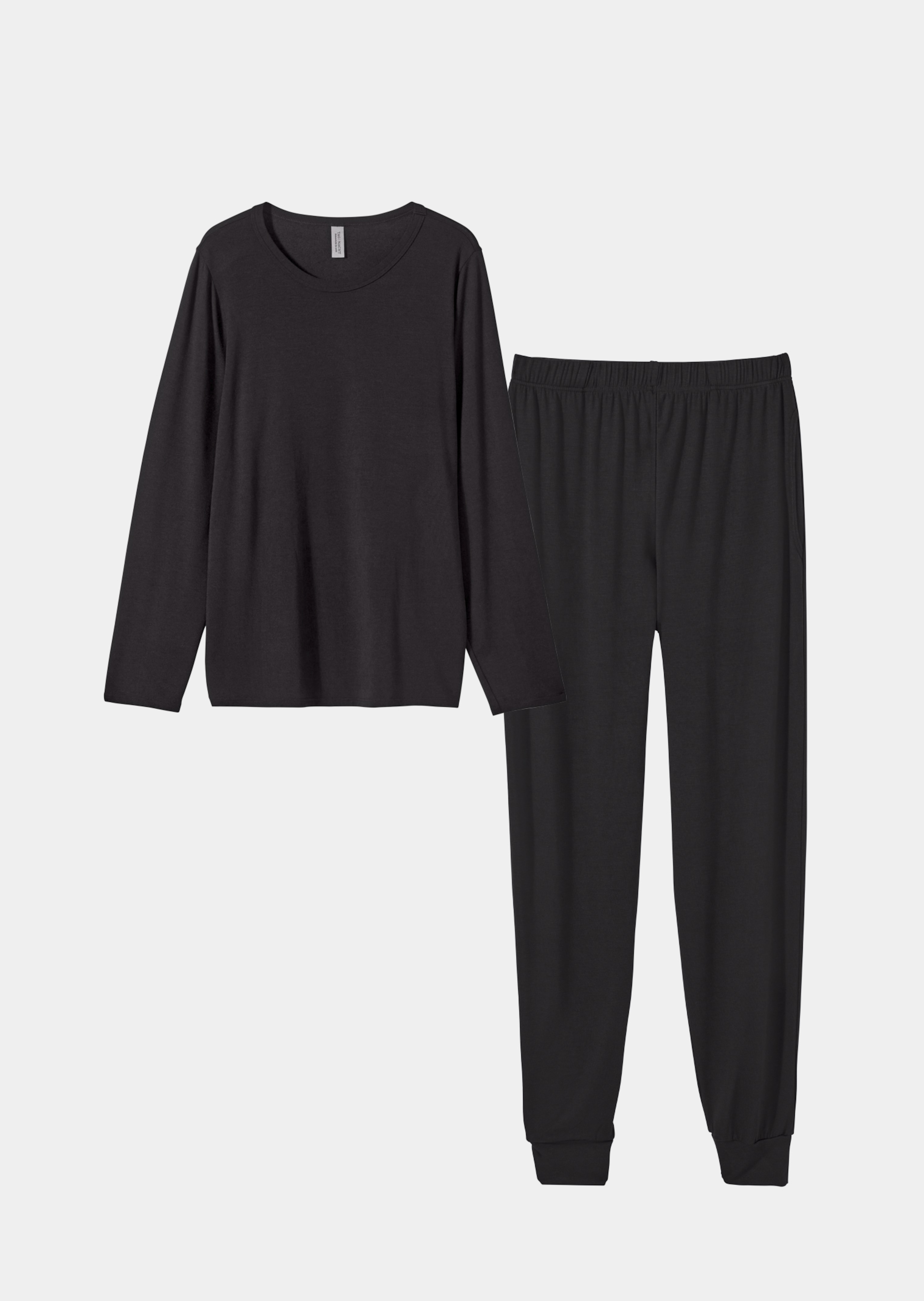 Kaksiosainen CON-TA oloasusetti pehmeää mikromodaalisekoitetta elastaanilla. Tämä sekoite on erityisen pehmeää tunnultaan ja siinä on hienostunut kiilto. Paita on pitkähihainen, rento malli ja pyöreä pääntie. Housuissa on joustava vyötärö, sivutaskut ja resorit lahkeensuissa. Ihanan mukava setti, joka sopii hyvin yöpuvuksi ja jota et enää halua riisua pois päivälläkään!