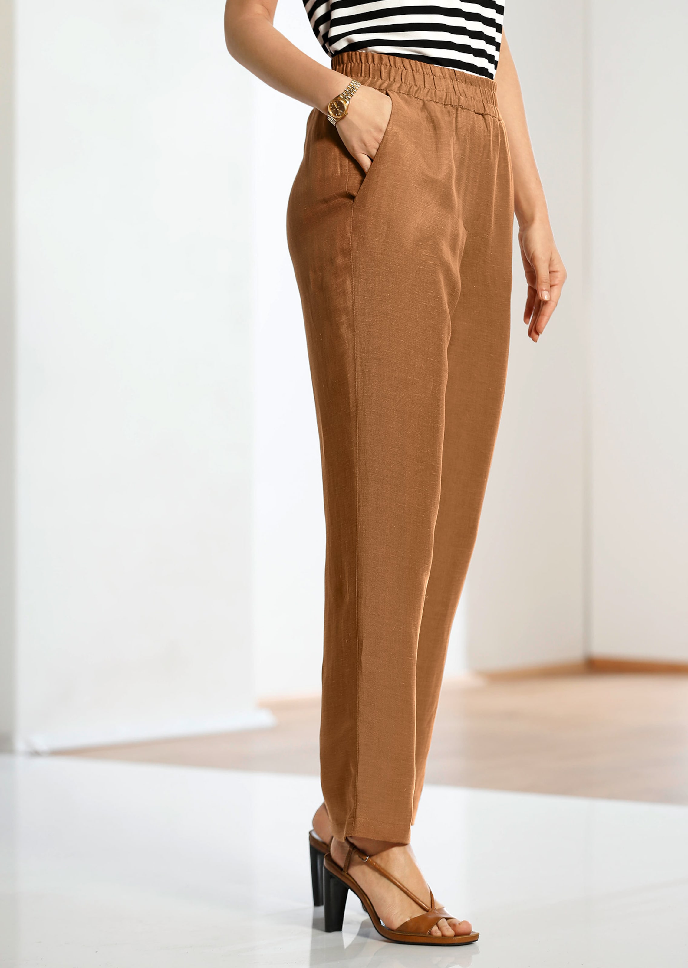 Pellavahousut ovat luonnollisella tavalla kauniit. Pellavaa on sekoitettu viskoosimaiseen materiaaliin, joten kangas hohtaa hillitysti. Vyötärö joustaa mukavasti ja valesepalus antaa housuille huolitellun loppusilauksen. Sivutaskut. Lahkeen leveys 42 cm. Suora lahje.
