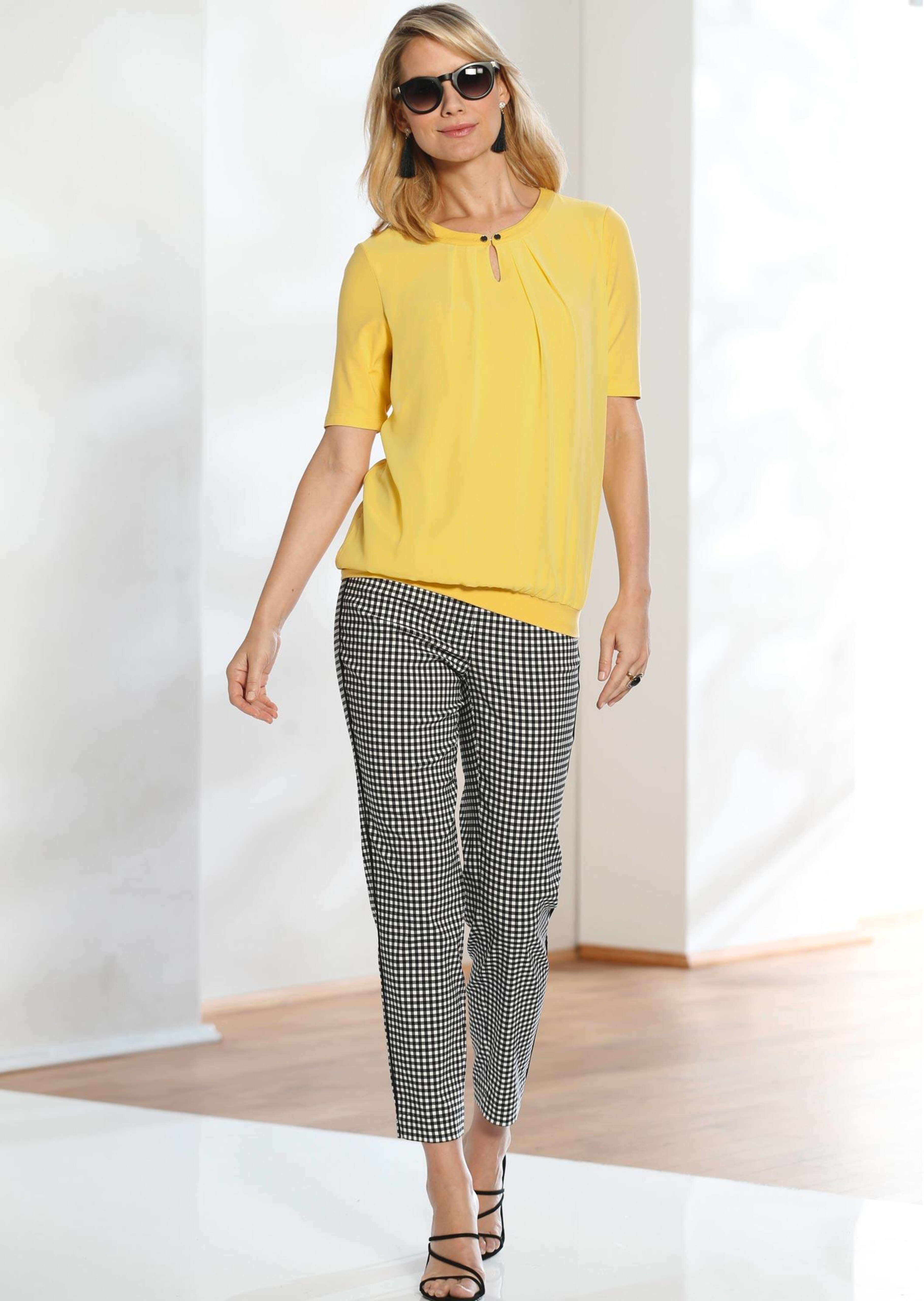 Puserossa yhdistyy kaksi kangasta: etuosa on kaksinkertaista sifonkia ja selkä on miellyttävää jerseyneulosta. Helmassa on resori. Pyöreä, käänteellinen pääntie, jossa koriste. Hihat ovat lyhyet. Pituus 65 cm koossa 46, 61 cm koossa 23.