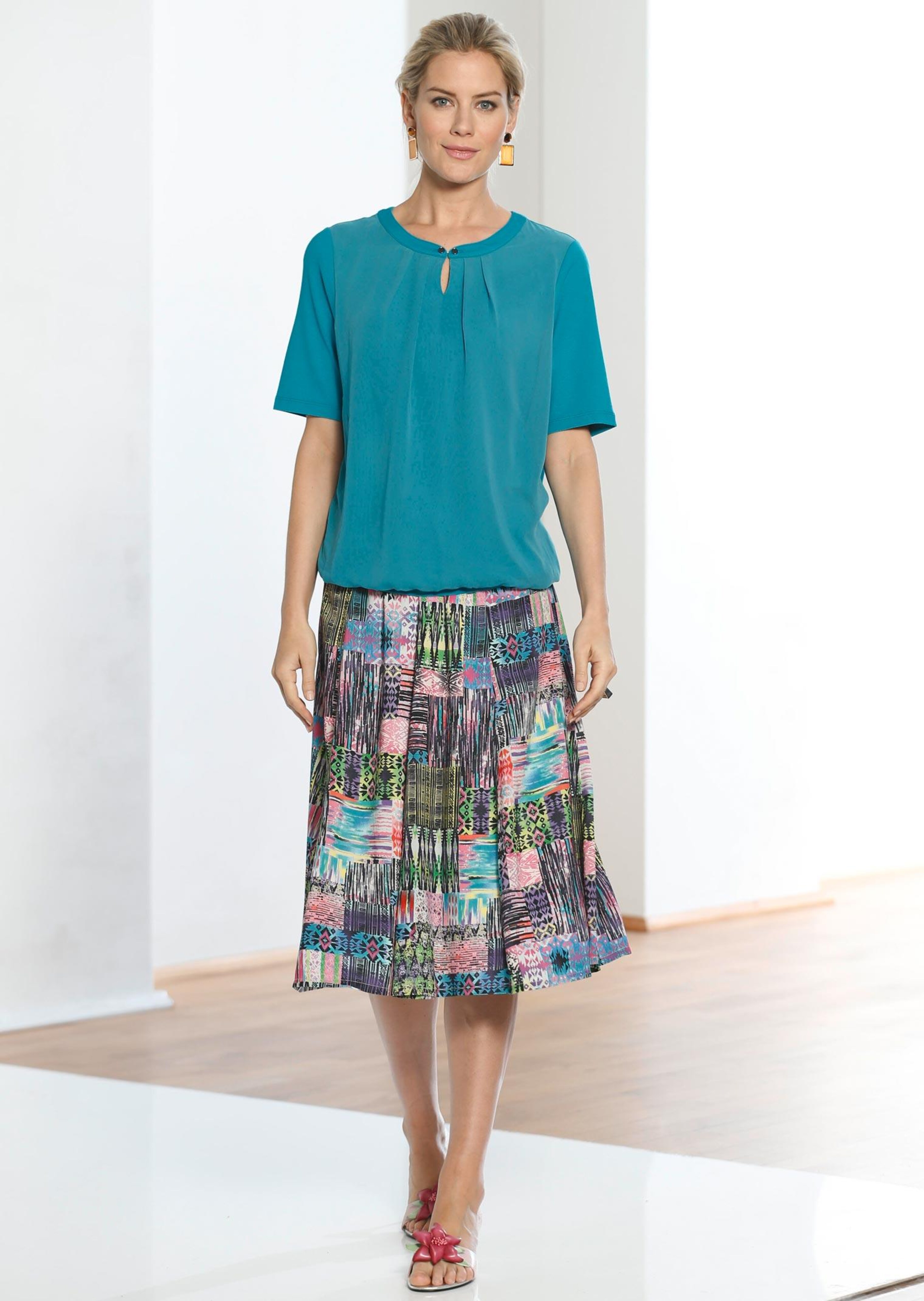 Puserossa yhdistyy kaksi kangasta: etuosa on kaksinkertaista sifonkia ja selkä on miellyttävää jerseyneulosta. Helmassa on resori. Pyöreä, käänteellinen pääntie, jossa koriste. Hihat ovat lyhyet. Pituus 65 cm koossa 46, 61 cm koossa 23.