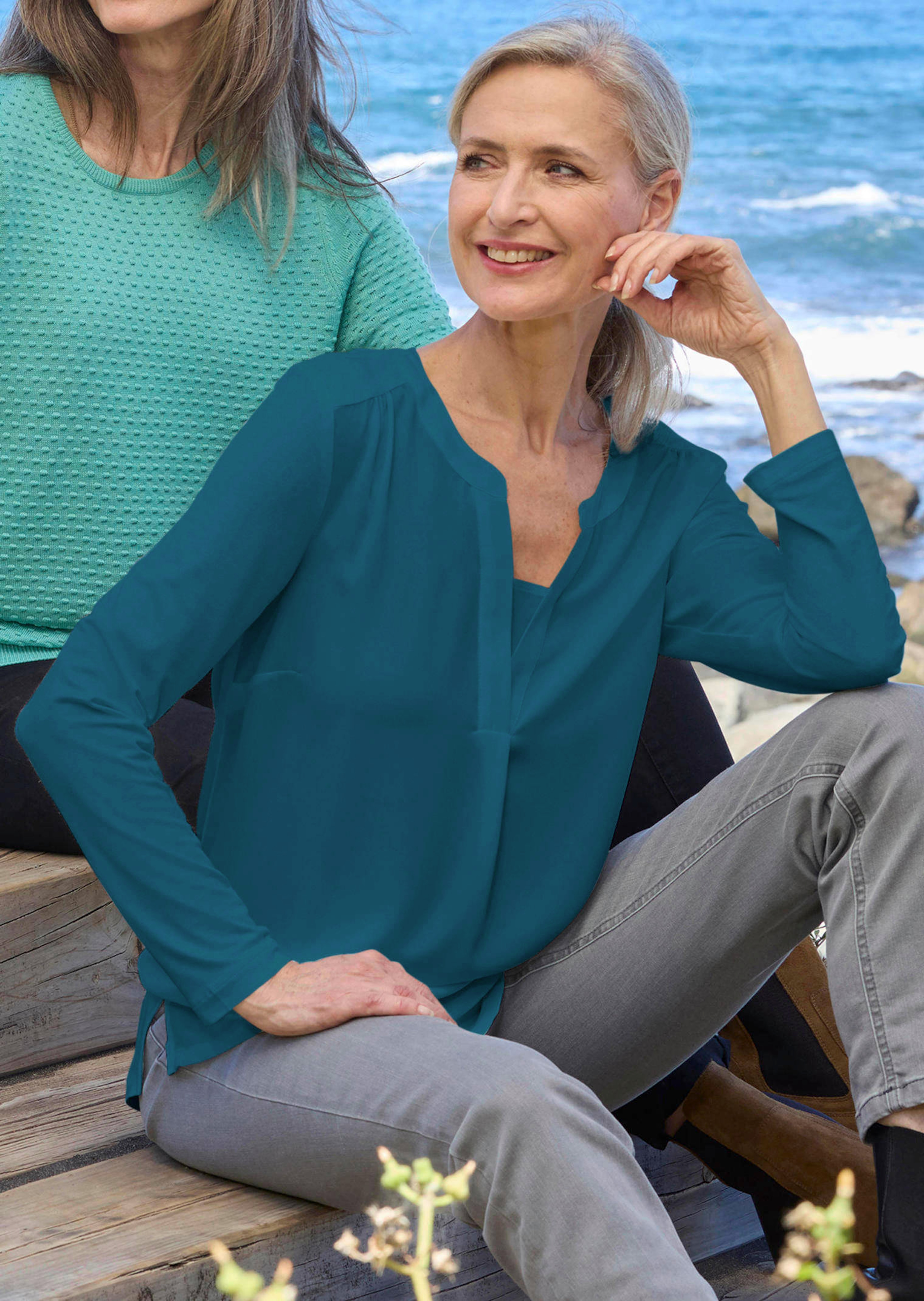 Puseropaita, jossa yhdistyvät puseron eleganssi ja paidan mukavuus. Etuosa ja pääntie on viimeistelty laskeutuvalla sifongilla kun taas hihat, selkä ja olkapäät erinomaista käyttömukavuutta lupaavalla jerseyllä. Pyöreä pääntie on vuorattu muotokaitaleella. Yhteensopiva, pidempi halkio keskellä helpottaa pukemista. Halkiot sivusaumoissa takaavat mukavan leveyden. Suora helma, lantiopituus. Pituus n. 69 cm koossa 46, n. 65 cm koossa 23