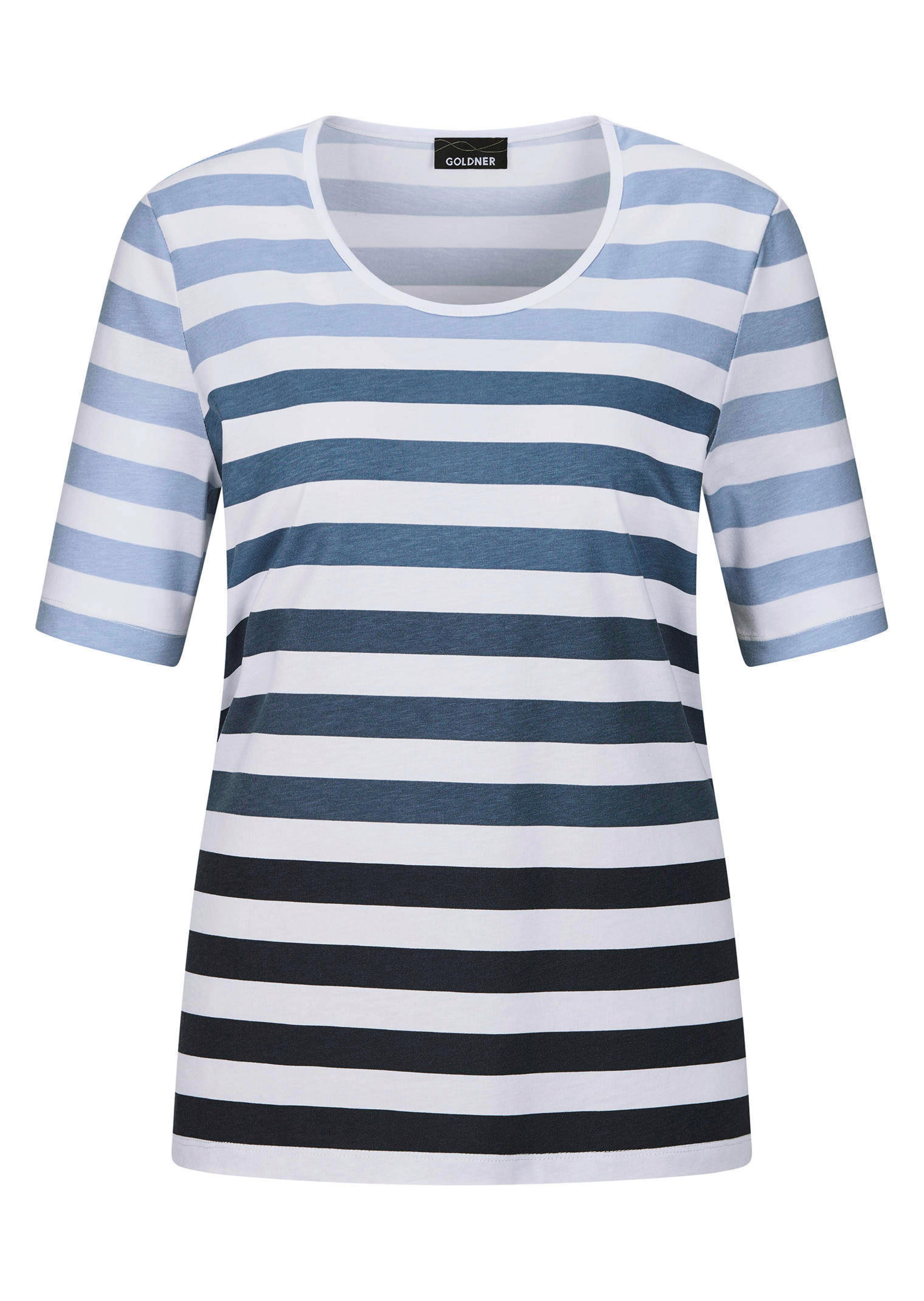 Raitakuviollinen paita hienostuneilla liukuväreillä. Puuvilla-modaalisekoite tuntuu mukavalta yllä ja sopii mainiosti arki- ja vapaa-ajan käyttöön. Naisellinen malli, pyöreä pääntie ja lyhyet hihat. Pituus noin 66 cm koossa 46, noin 62 cm koossa 23.