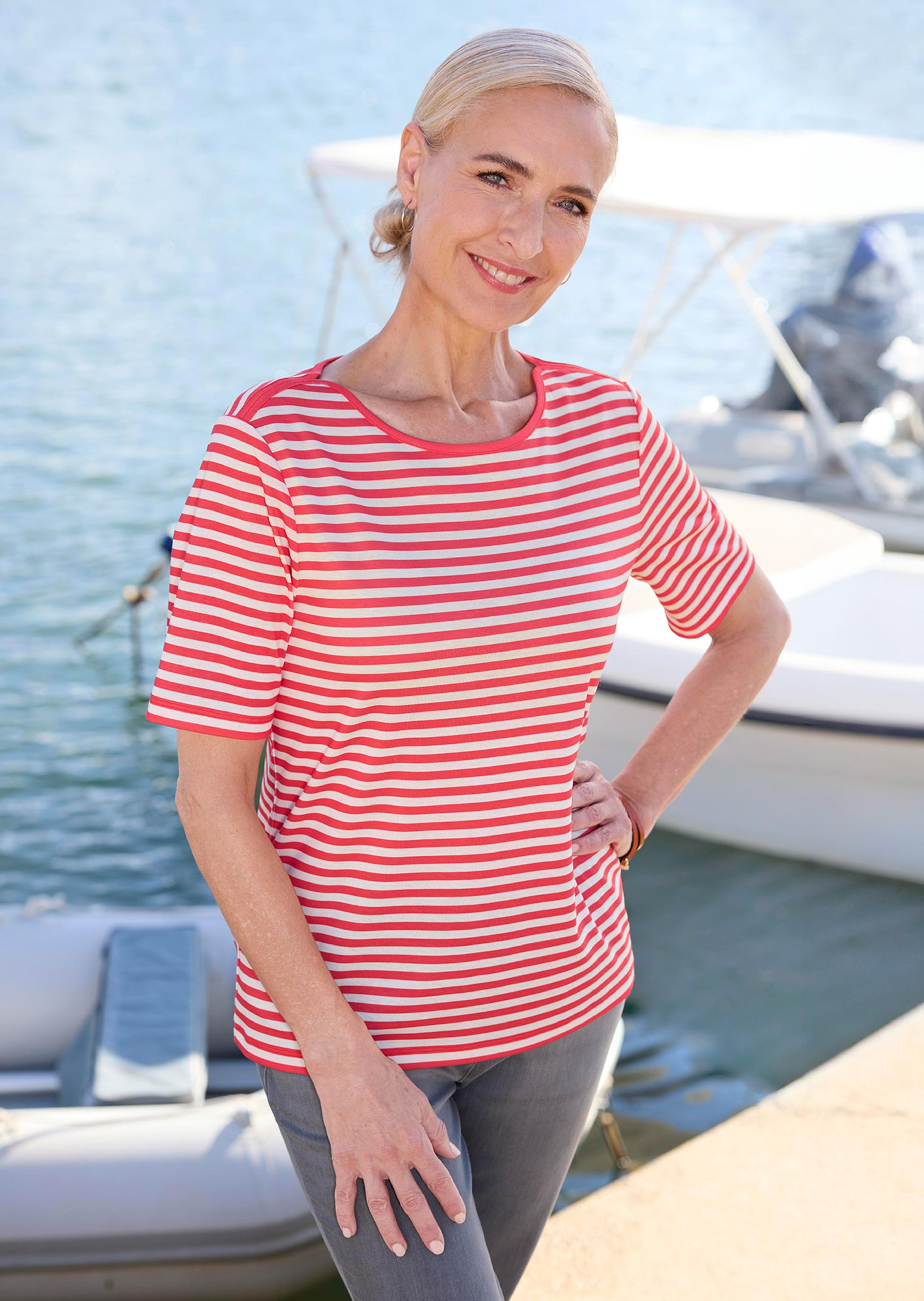 Raidallinen paita kahdessa värissä – täydellinen lisä merihenkiseen tyyliisi! Ihoystävällisestä viskoosijerseystä valmistettu paita tuntuu pehmeältä ja joustavalta. Venepääntie on reunustettu yksivärisellä paneelilla, joka kulkee olalta olalle. Suora malli puolipitkillä hihoilla, mutkaton kumppani jokapäiväiseen rentoon lookiisi! Pituus noin 64 cm. 46, koko noin 60 cm.
