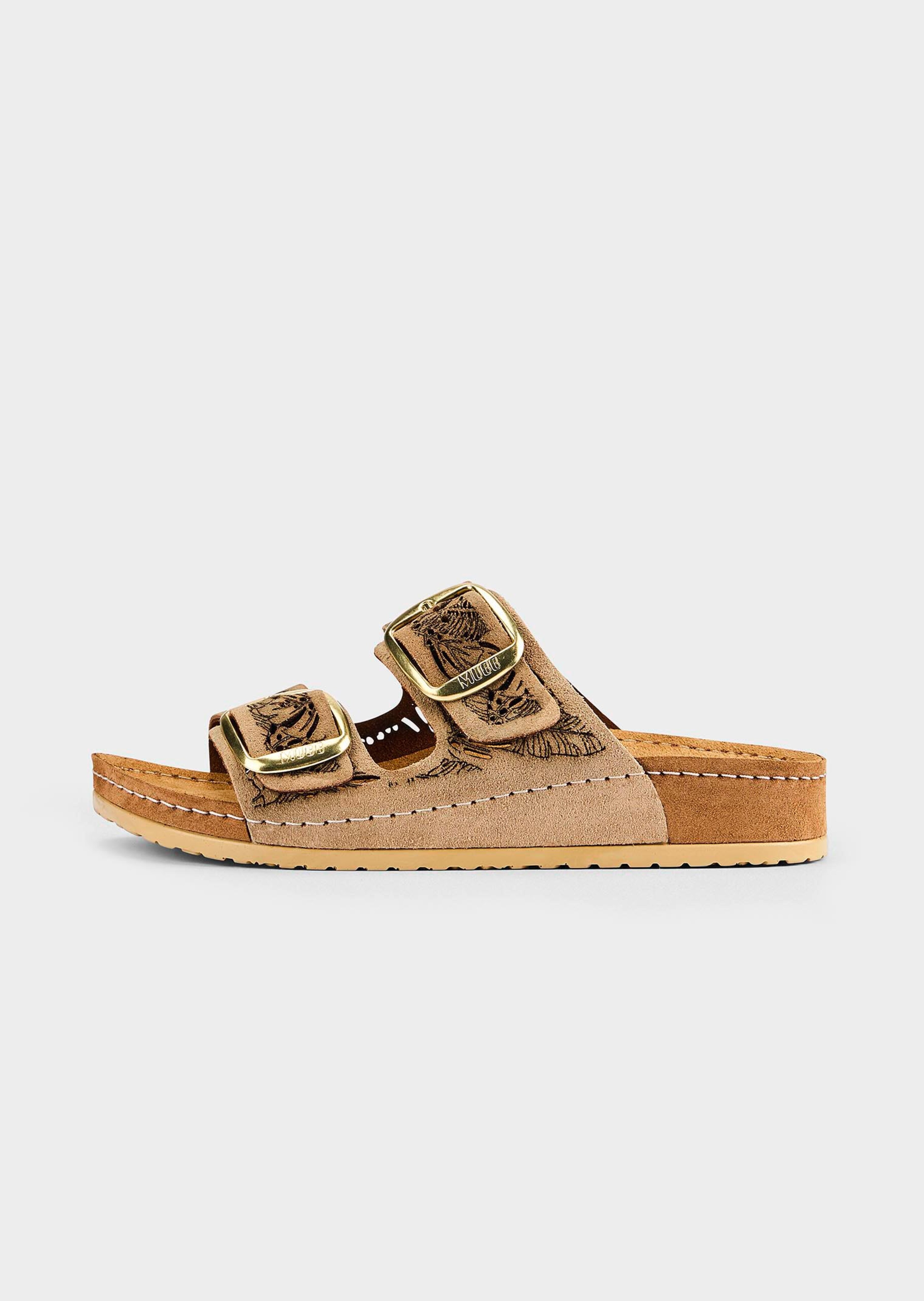 MUBB-sandaalit – aito nahka on miellyttävä jalassa, pehmeä Memory-pohjallinen tuntuu siltä kuin kävelisit pilvien päällä. Malli, jossa sievät ornamenttikoristeet. Helppo sujauttaa jalkaan, kaksi kiiltävää solkea. Mukava synteettinen ulkopohja. H-lesti.