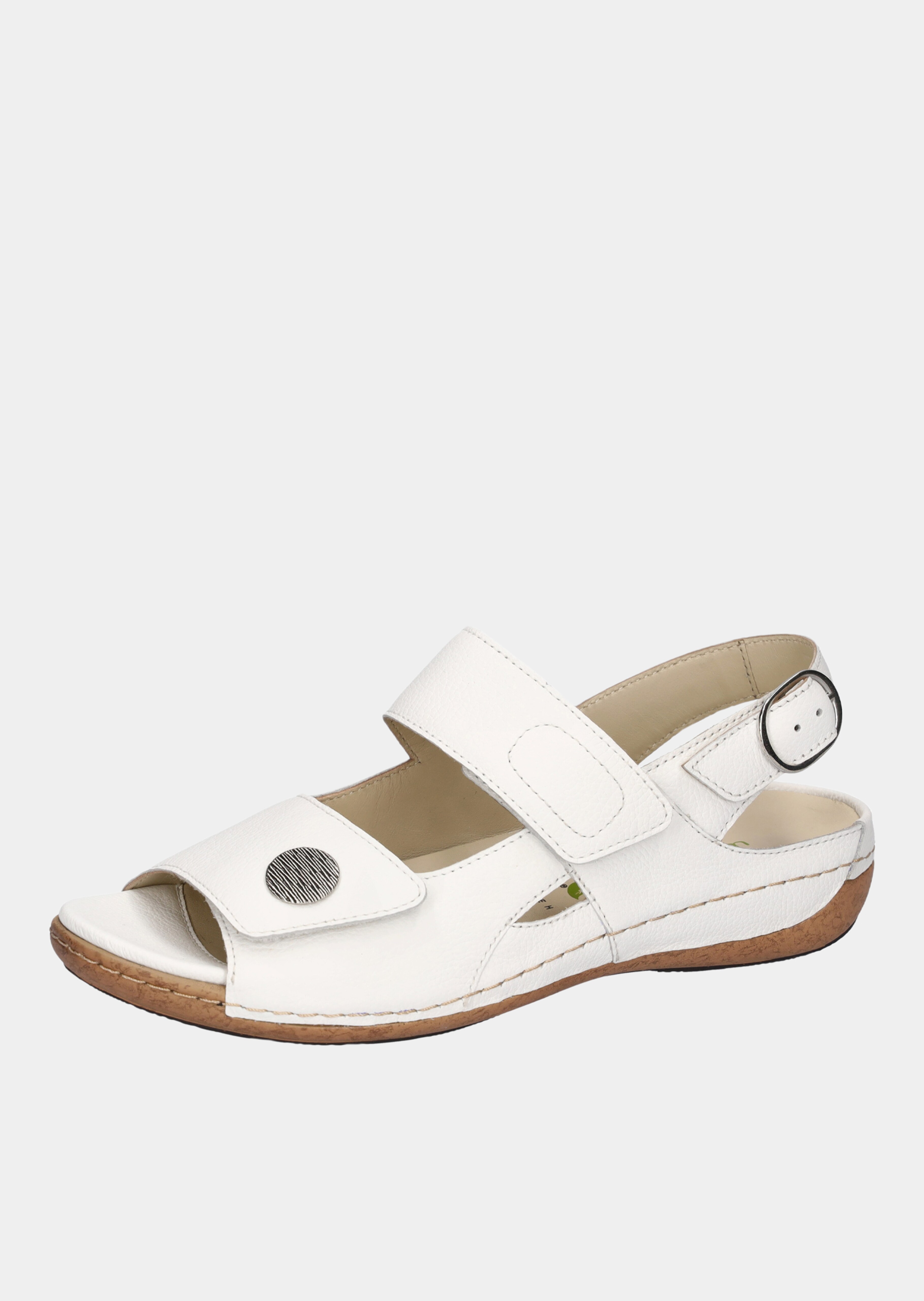 WALDLÄUFER-sandaalit aitoa nahkaa PU-ulkopohjalla. Kaksi tarrakiinnitystä ja painonappi remmissä mahdollistavat helpon jalkaan laiton ja riisumisen. Muodikas malli, jossa koristenappi ja käsin ommeltu sauma siirtymässä pohjaan. Vaihdettava pohjallinen. Mukava H-lesti.