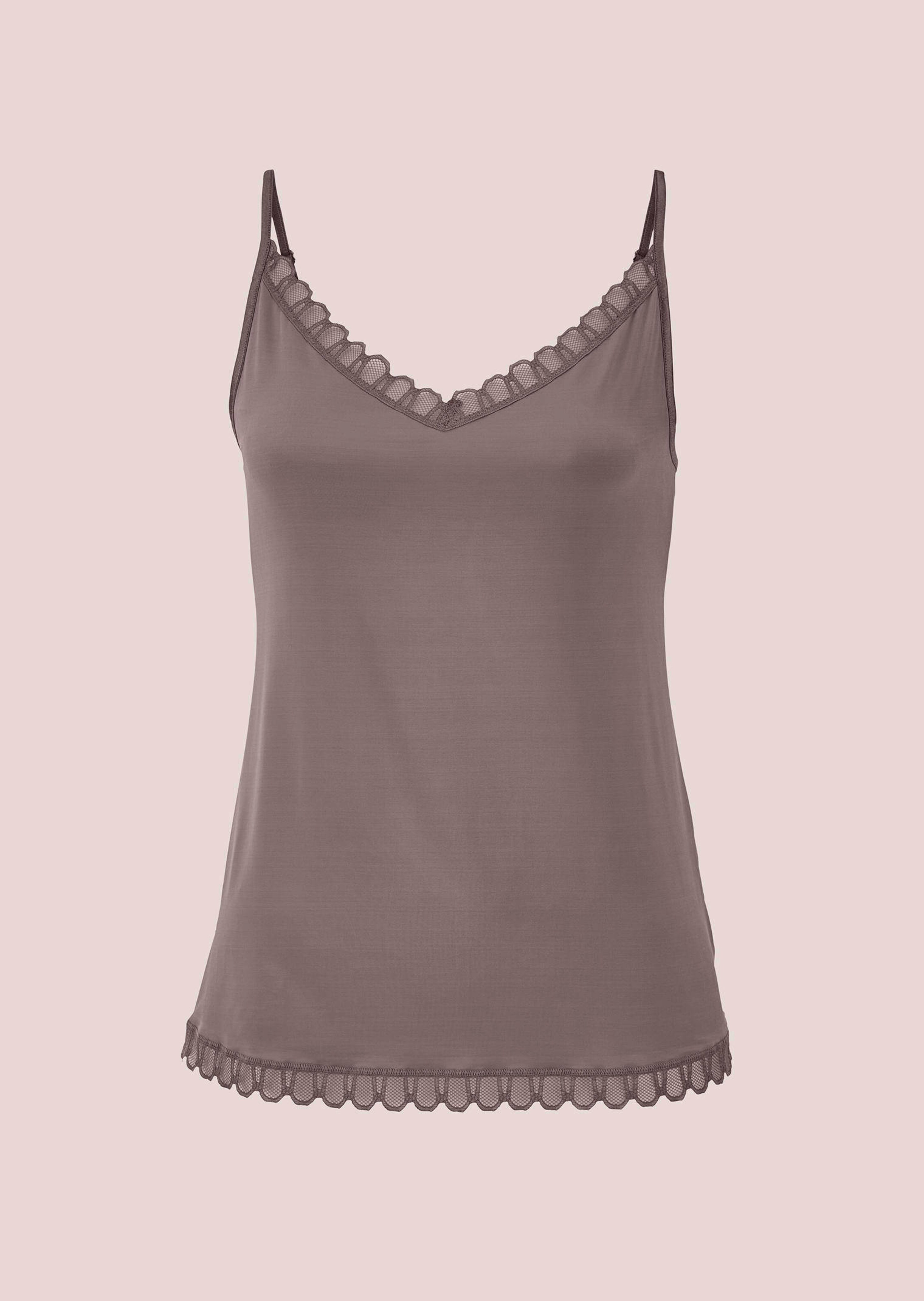 Hienoja yksityiskohtia ja kauniisti laskeutuvaa materiaalia. MEYn spagettiolkaintoppi on silkinpehmeää viskoosia, joka liukuu pehmeästi iholla. Kaula-aukon ja helman hienot pitsireunukset antavat sille elegantin ilmeen, ja selkäosan säädettävät olkaimet tarjoavat muunneltavaa käyttömukavuutta. Toppia voi käyttää sellaisenaan tai kivana aluskerroksena puseron alla. Se tarjoaa käyttömukavuutta naiselliseen tyyliin.