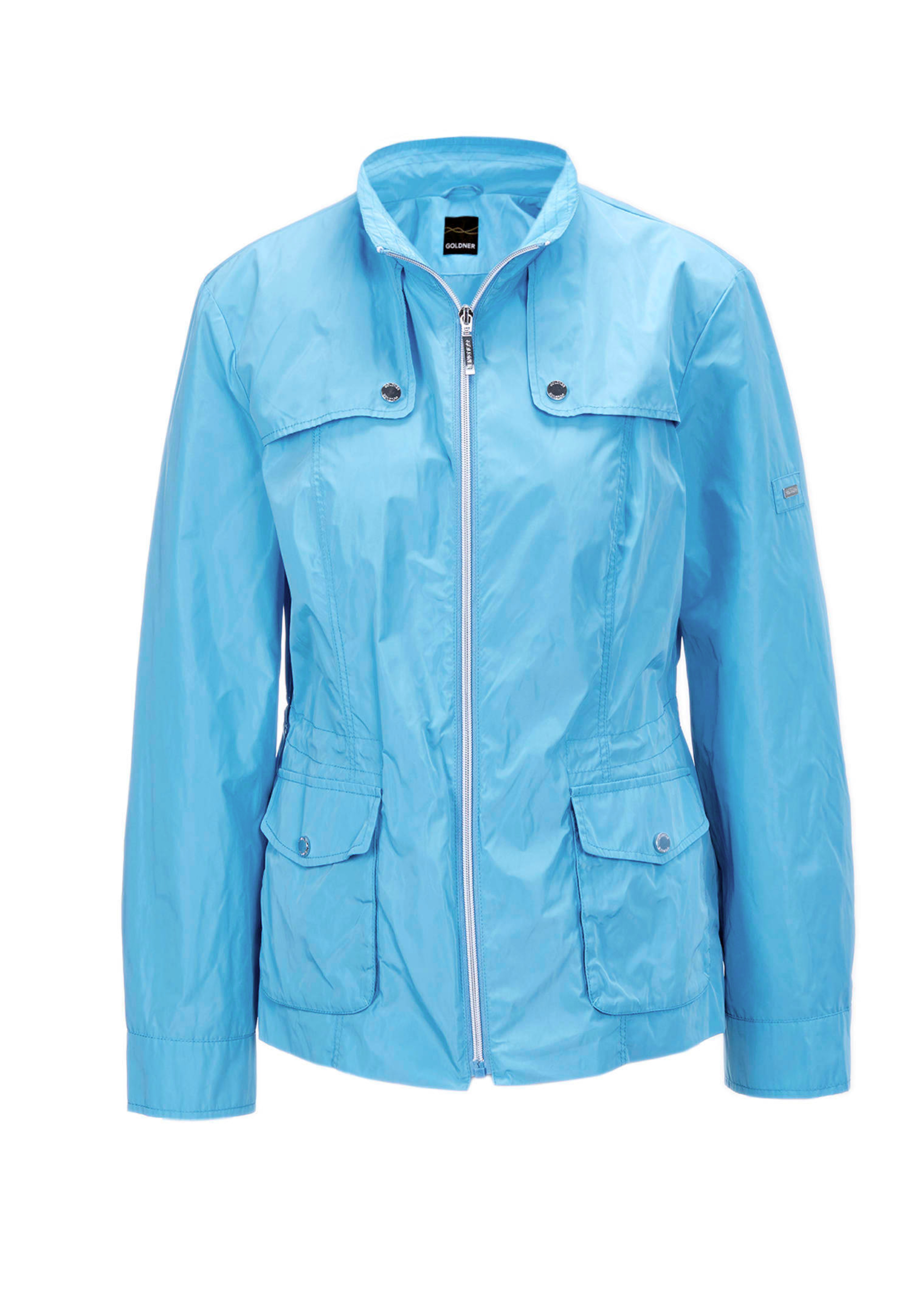 Moderni takki, jossa kiristysnyöri vyötäröllä, pystykaulus ja koristeelliset painonapit. Takissa on tilavat päällitaskut reisitaskutyyliin ja hihoissa leveät mansetit. Ryhtiä tuovat ompeleet. Ihanan kevyttä kangasta. Pituus 67 cm koossa 46, 63 cm koossa 23.