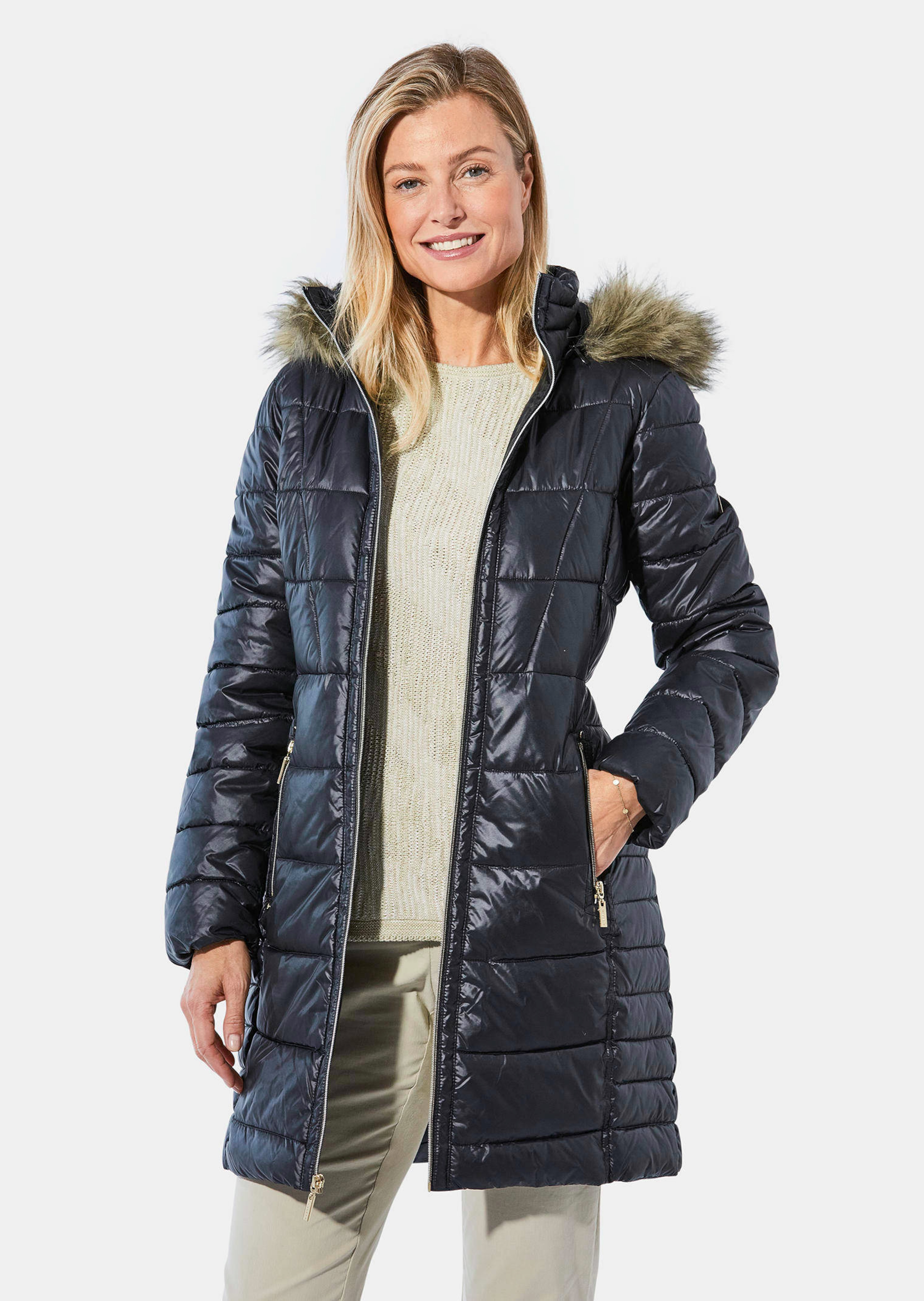 Tikkitakki, jossa pehmeä tekoturkisreunus irrotettavassa hupussa – tyylikäs katseenvangitsija ja käytännöllinen tuulensuoja samanaikaisesti. Vinoon ommellut muotosaumat edessä ja takana luovat erityisen tyylikkään siluetin. Molemmin puolin olevat kapeat pitkittäisompeleet saavat sinut näyttämään hoikemmalta. Korkea pystykaulus ja vetoketju suojaavat sinua kylmältä ja tuulelta. Käytännölliset vetoketjulliset pystytaskut pitävät kätesi lämpiminä ja suojaavat tavaroitasi. Muhkea toppaus ja pidempi malli tekevät takista täydellisen talvitakin. Takki on mitoitukseltaan yhtä kokoa tavallista pienempi.Tilaa takki yhtä kokoa suurempana kuin normaalisti.
