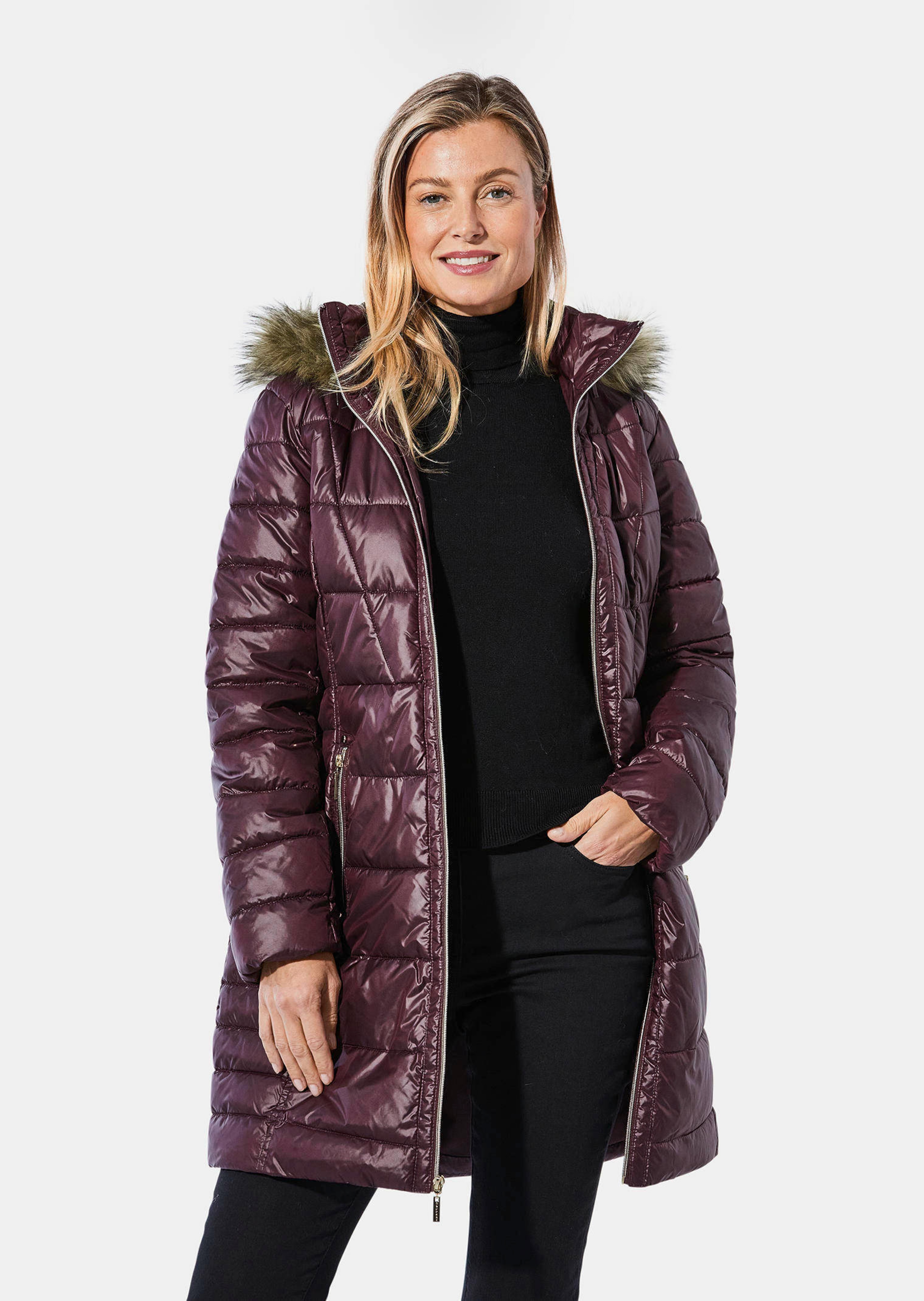 Tikkitakki, jossa pehmeä tekoturkisreunus irrotettavassa hupussa – tyylikäs katseenvangitsija ja käytännöllinen tuulensuoja samanaikaisesti. Vinoon ommellut muotosaumat edessä ja takana luovat erityisen tyylikkään siluetin. Molemmin puolin olevat kapeat pitkittäisompeleet saavat sinut näyttämään hoikemmalta. Korkea pystykaulus ja vetoketju suojaavat sinua kylmältä ja tuulelta. Käytännölliset vetoketjulliset pystytaskut pitävät kätesi lämpiminä ja suojaavat tavaroitasi. Muhkea toppaus ja pidempi malli tekevät takista täydellisen talvitakin. Takki on mitoitukseltaan yhtä kokoa tavallista pienempi.Tilaa takki yhtä kokoa suurempana kuin normaalisti.