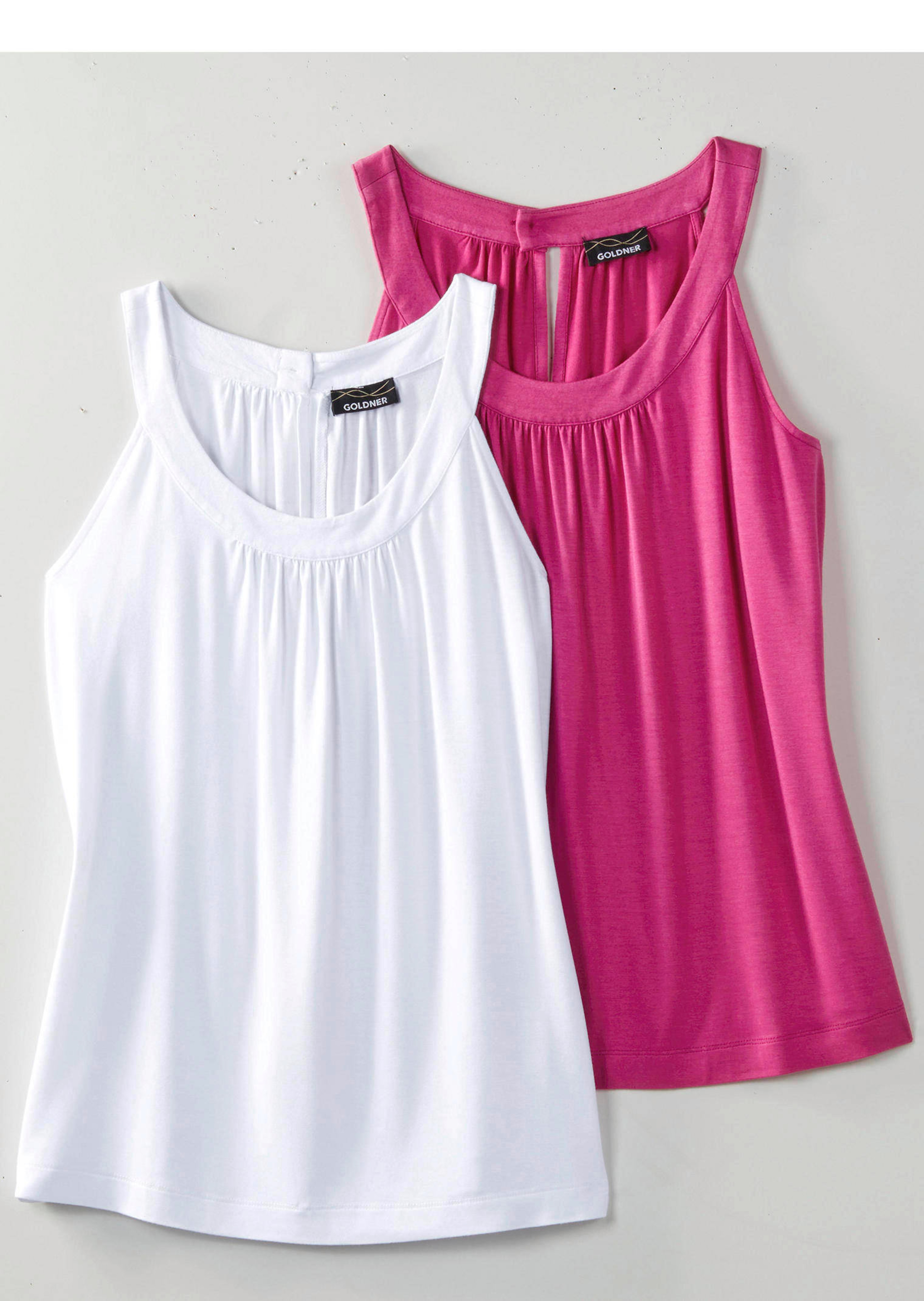 Kaksi toppia. Värillisen mallin lisäksi saat valkoisen topin – täydellinen yhdistelmäkumppani. Pyöreä pääntie on viimeistelty tereellä, joka muuttuu leveiksi olkahihnoiksi. Kauniit laskokset edessä ja takana antavat topille rennon istuvuuden. Mukavasta viskoositrikoosta valmistettu uusi yhdistelmäsuosikkisi moniin kesäisiin asuihin. Pituus n. 64 cm koossa 46, n. 60 cm koossa 23.